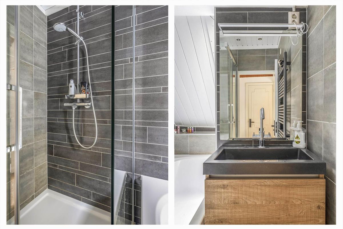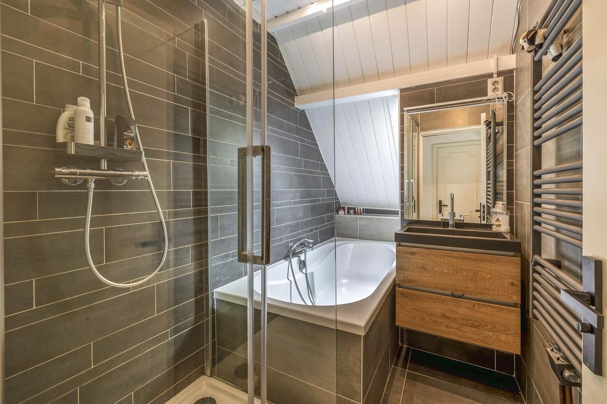 De moderne badkamer (2017) beschikt over een ligbad, een douche en een wastafelmeubel.