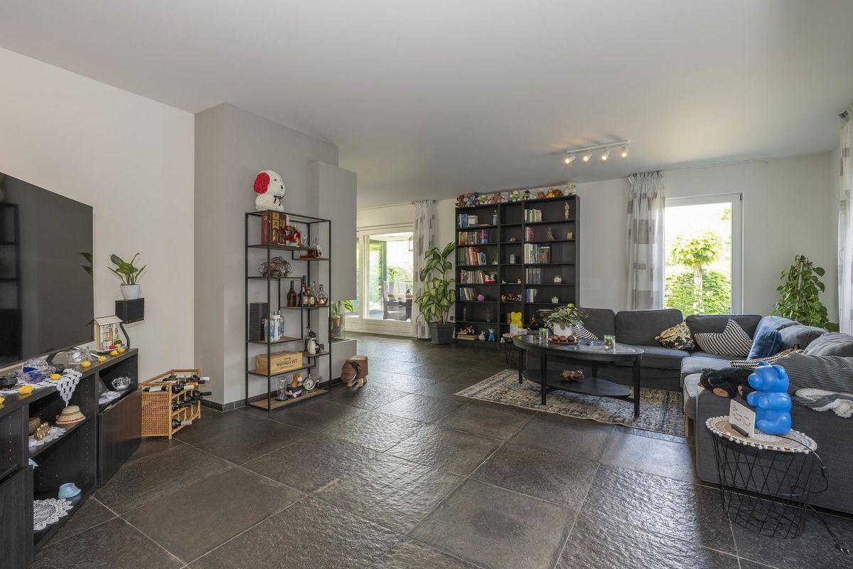 Het leefgedeelte beslaat maar liefst 112 m² en bestaat uit de woonkamer (37 m²), open keuken (31 m²) en eetkamer (44 m²). Alle ruimtes zijn afgewerkt met stijlvolle leisteenvloeren.