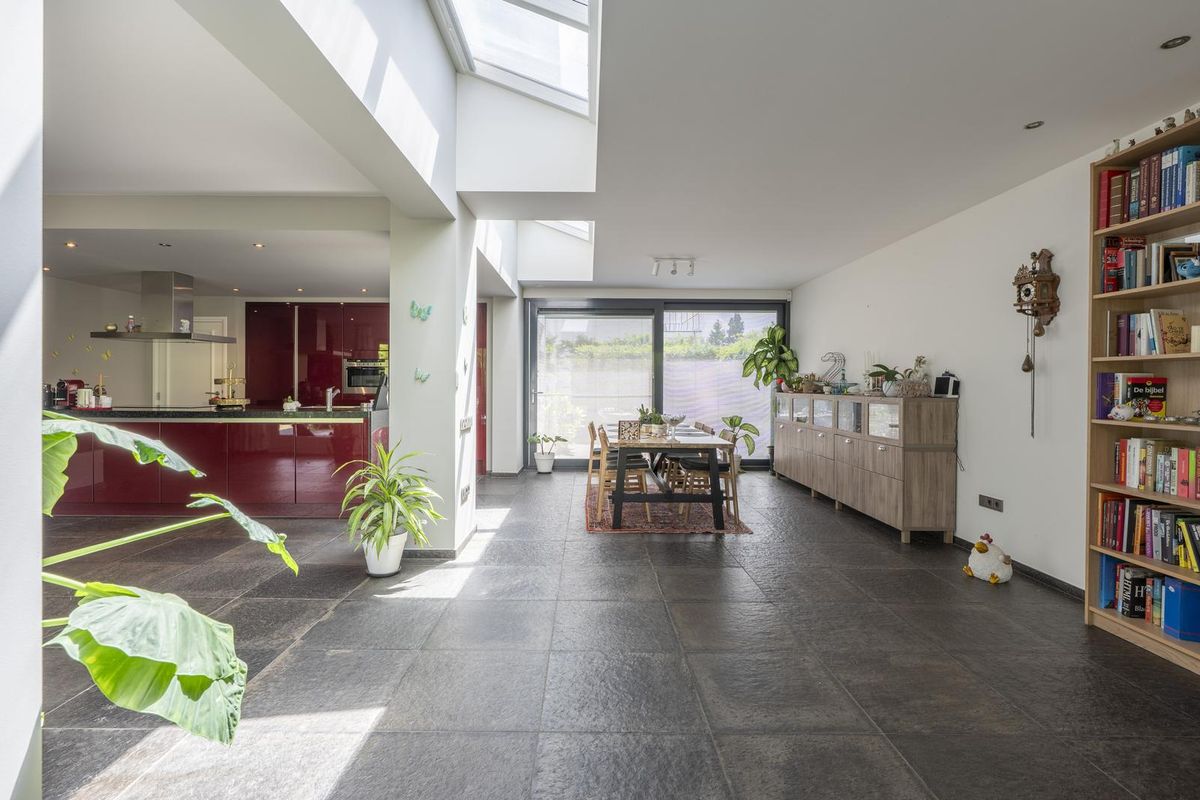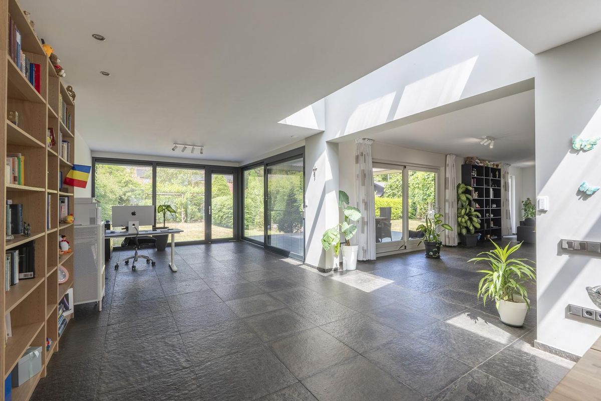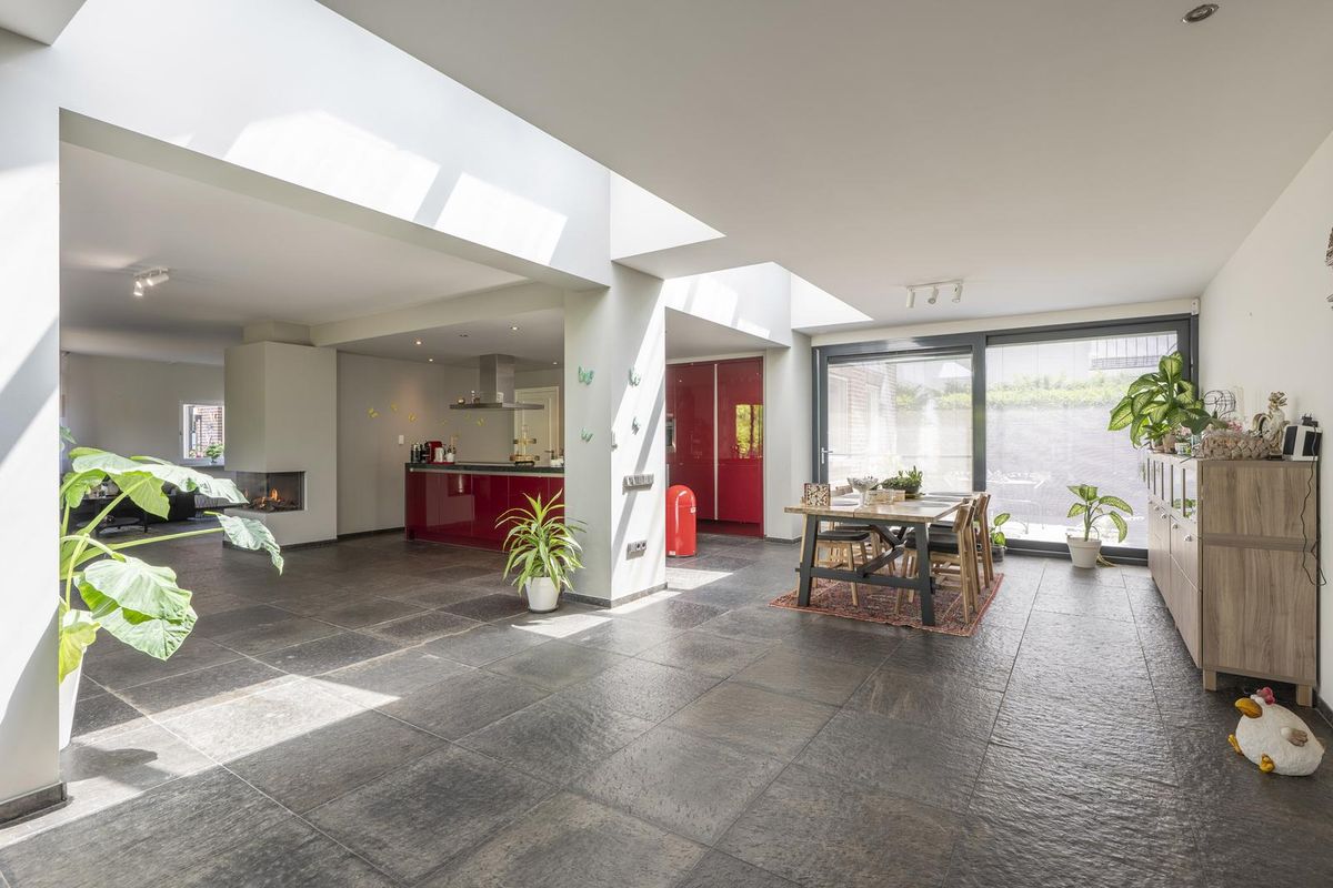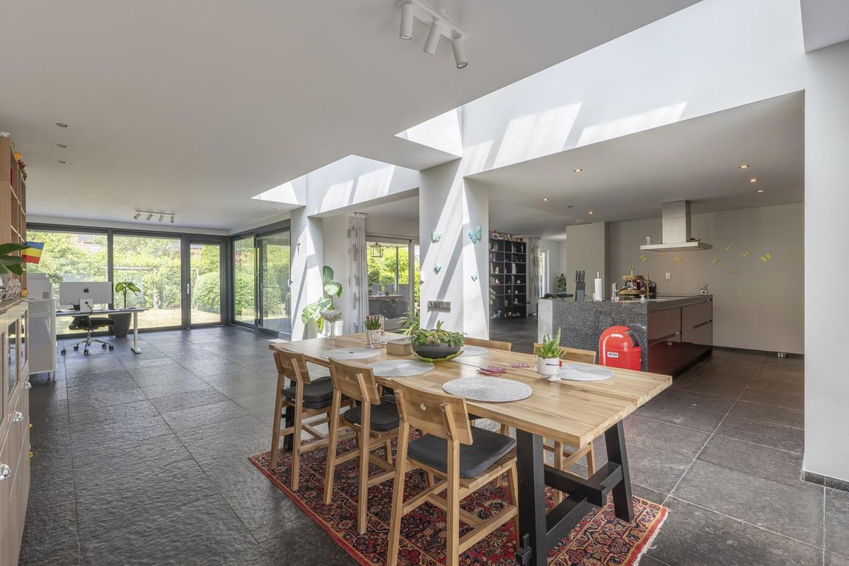 De moderne open keuken is voorzien van een luxe keukenopstelling met inductiekookplaat, combioven, koel-vriescombinatie, afzuigkap en vaatwasser. Dankzij de schuifpui heb je hier direct contact met de tuin. De royale eetkamer is bijzonder licht dankzij de grote glaspartijen met geïntegreerde jaloezieën. Deze ruimte leent zich uitstekend voor een grote eettafel en biedt daarnaast plek voor een speelhoek of werkplek. Aan één zijde is er toegang tot een gezellige patiotuin; aan de andere zijde loop je direct door naar het overdekte terras en de tuin.