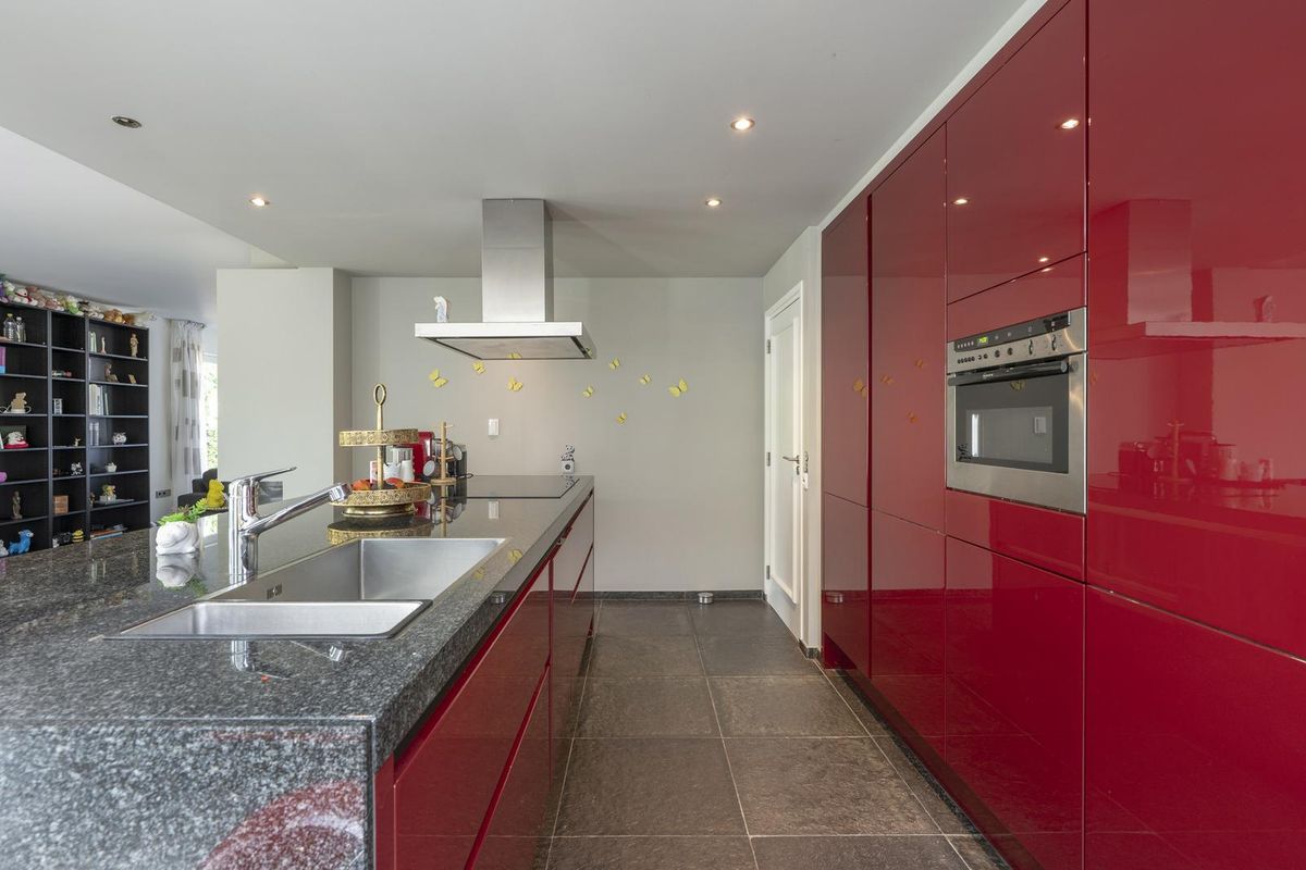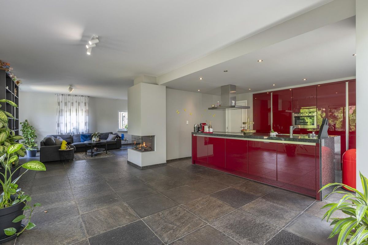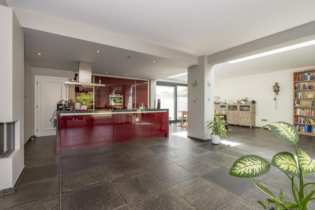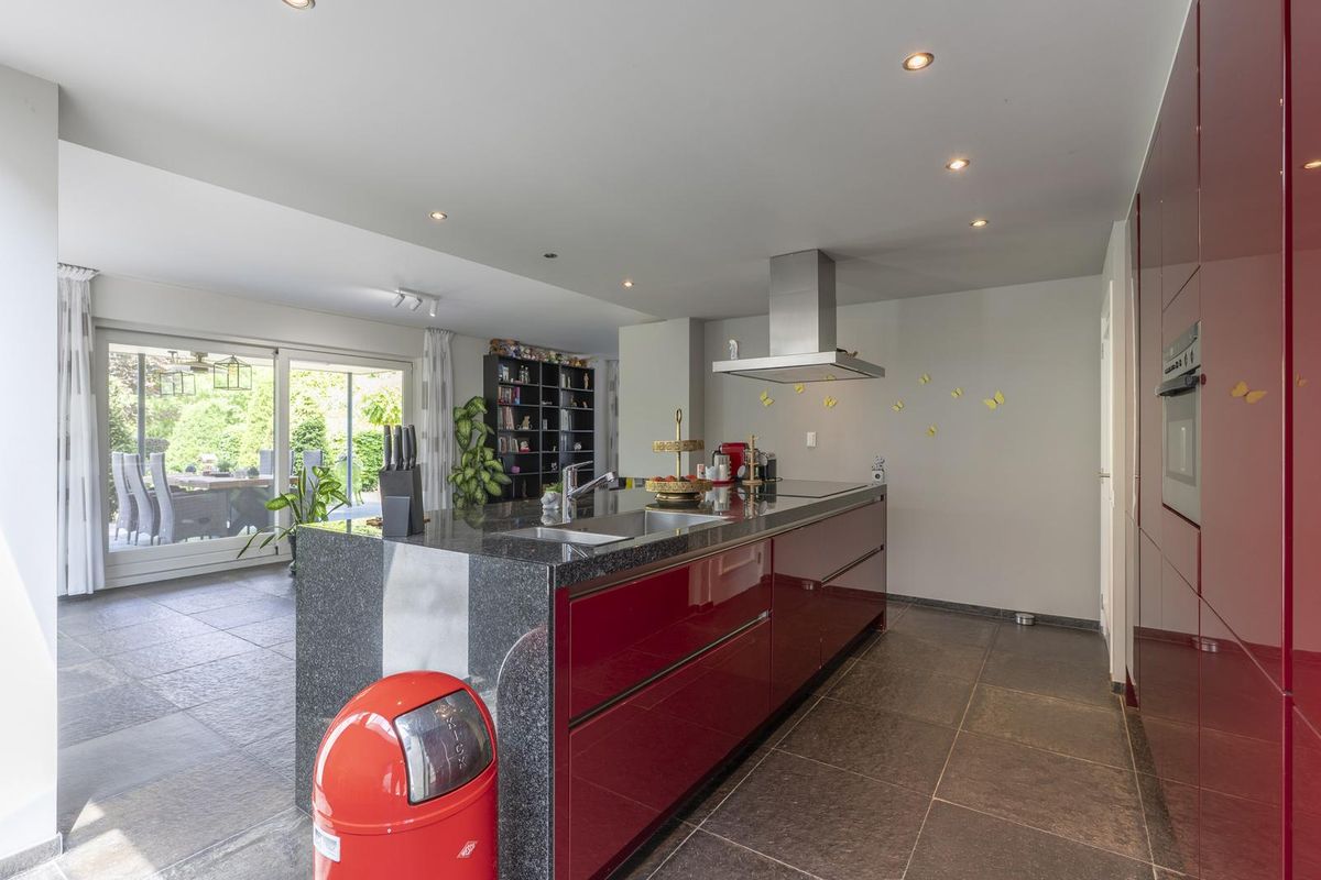 De moderne open keuken is voorzien van een luxe keukenopstelling met inductiekookplaat, combioven, koel-vriescombinatie, afzuigkap en vaatwasser. Dankzij de schuifpui heb je hier direct contact met de tuin. De royale eetkamer is bijzonder licht dankzij de grote glaspartijen met geïntegreerde jaloezieën. Deze ruimte leent zich uitstekend voor een grote eettafel en biedt daarnaast plek voor een speelhoek of werkplek. Aan één zijde is er toegang tot een gezellige patiotuin; aan de andere zijde loop je direct door naar het overdekte terras en de tuin.