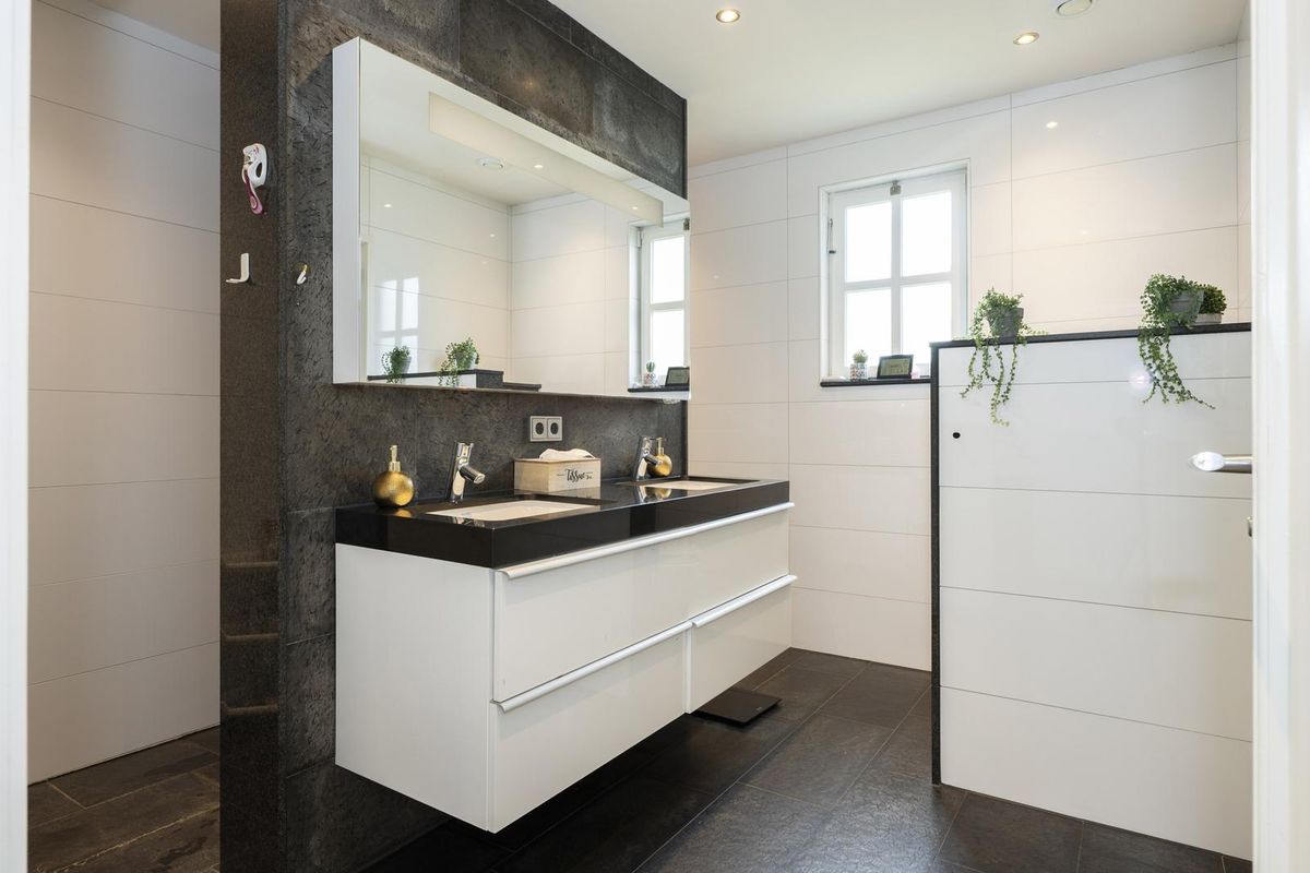 De geheel betegelde badkamer is voorzien van een inloopdouche, wastafelmeubel en zwevend toilet.