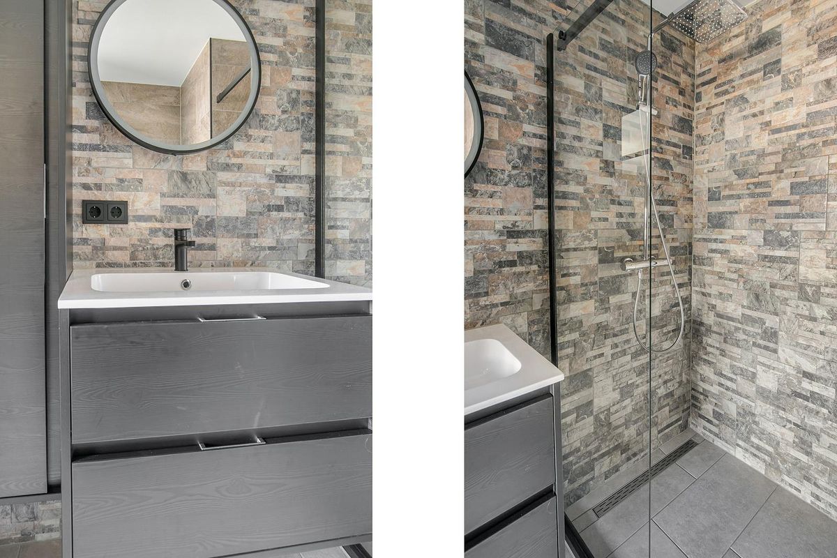 De badkamer is luxe uitgevoerd en voorzien van een inloopdouche met regendouche, een badkamermeubel met wastafel, spiegelverlichting en aansluitingen voor zowel wasmachine als droger.