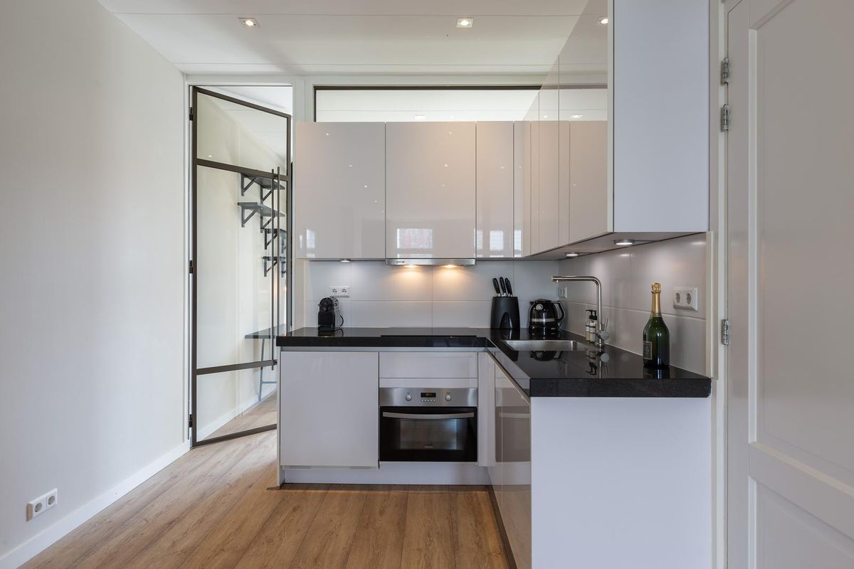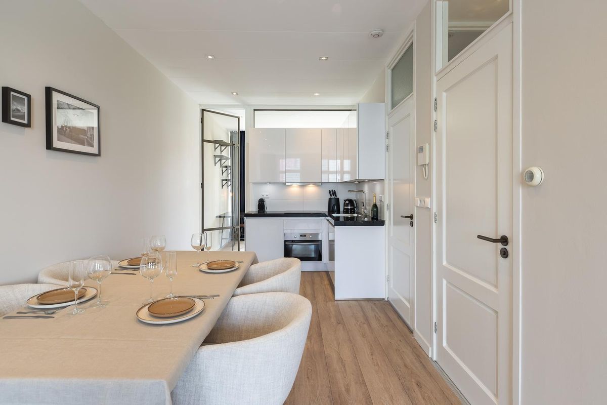 Rechts van de woonkamer bevindt zich de witte L-vormige keuken. Met inbouwapparatuur en strak design biedt het een nette, tijdloze look. De keuken werd vernieuwd in 2016 en is sindsdien met zorg onderhouden. Direct aangrenzend is ruimte voor een eettafel, perfect voor een intiem diner of werkmoment met uitzicht op de kade en de Maas.