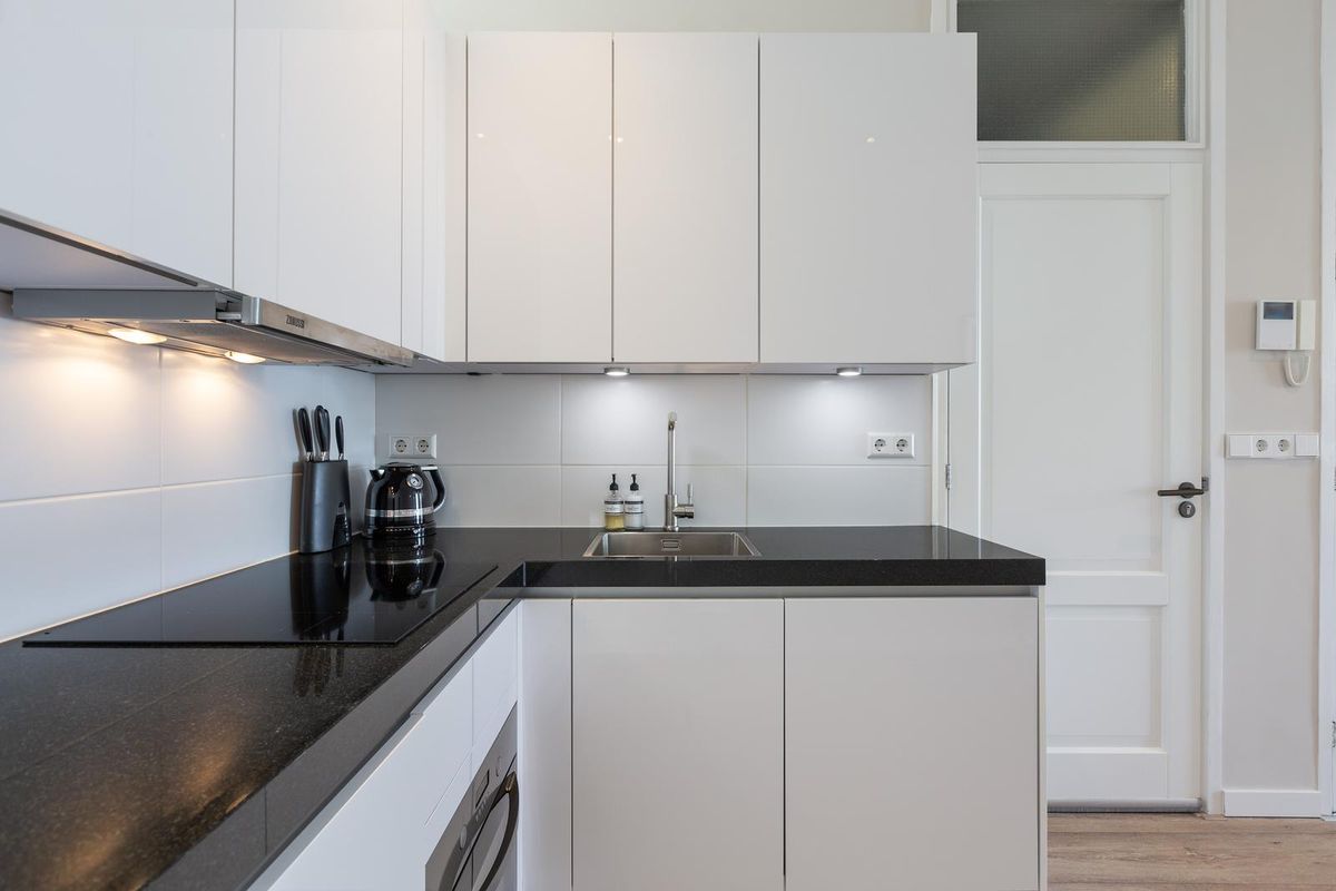 To the right of the living room is the white L-shaped kitchen. Featuring built-in appliances and a sleek design, it offers a neat, timeless look. The kitchen was renovated in 2016 and has been carefully maintained ever since. Adjacent to it is space for a dining table, perfect for an intimate dinner or a work session with views of the quay and the Maas.