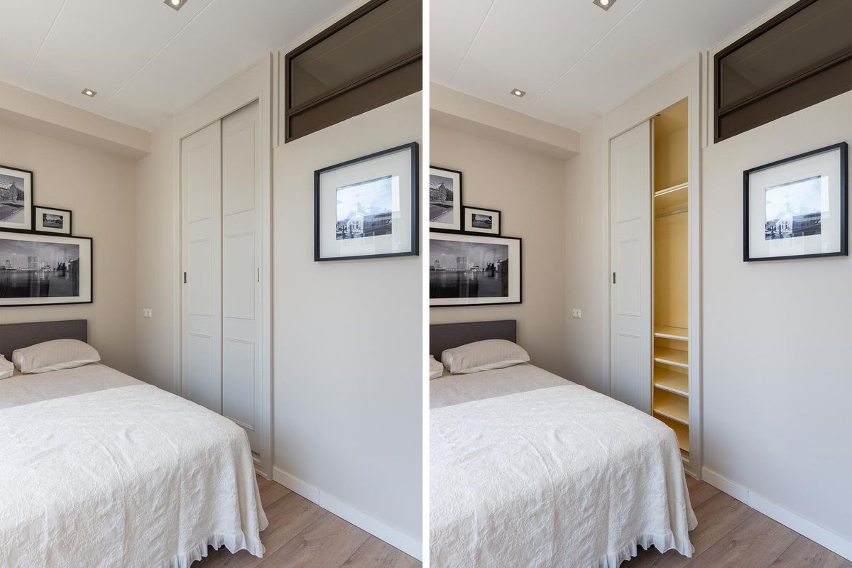Achter de keuken of via de overloop bereik je de slaapkamer: een rustige, ruime kamer met prettige lichtinval. Een vaste kast biedt opbergruimte en de neutraliteit van hout en wit maakt het een fijne plek om tot rust te komen.