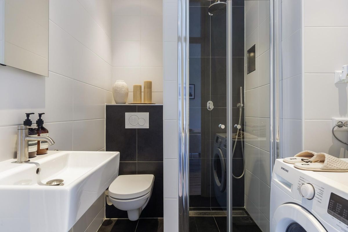 De badkamer is functioneel ingericht: inloopdouche, wastafelmeubel, hangend toilet en wasmachineaansluiting. De ruimte werd begin 2016 geheel vernieuwd en is praktisch én stijlvol afgewerkt. Alles aanwezig voor comfortabel wonen.