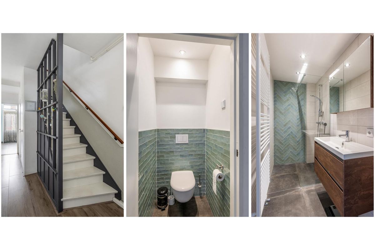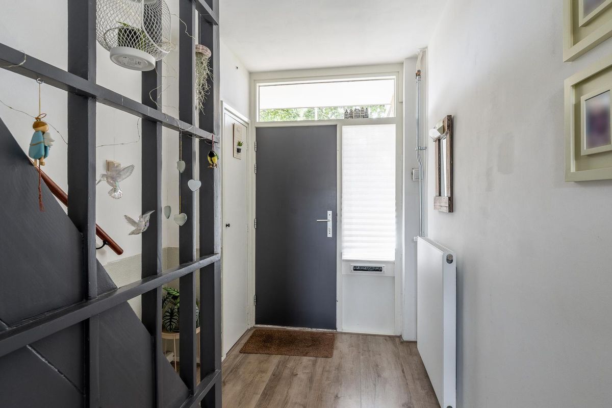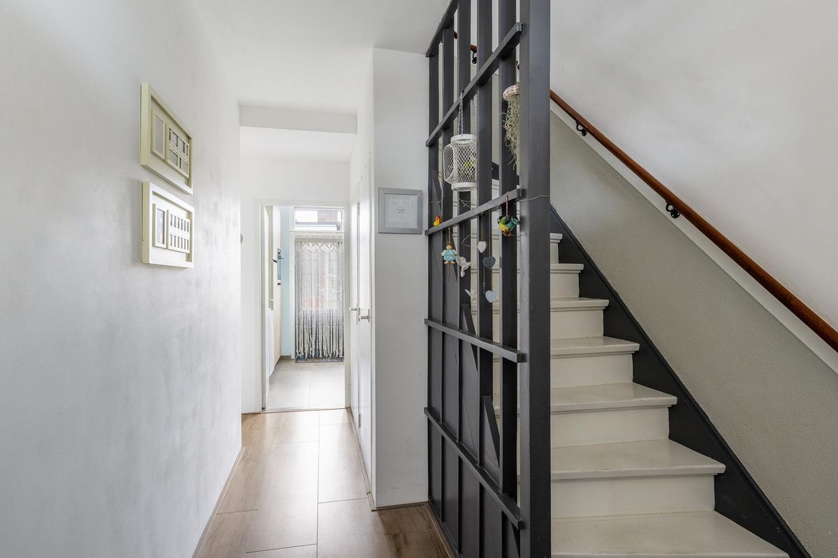 Hal/entree met de meterkast (6 groepen, 2 aardlekschakelaars en slimme meters), deels betegeld hangtoilet met plafondventilator, trapopgang, trapkast en toegang tot de woonkamer en keuken.