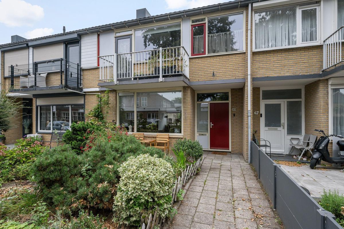 De diepe voortuin is voorzien van bestrating en een plantenborder met diverse planten en struiken waardoor er veel privacy in de woonkamer is.