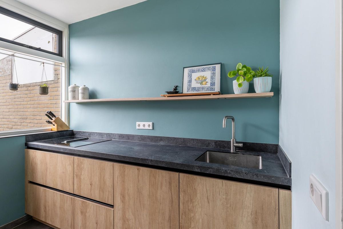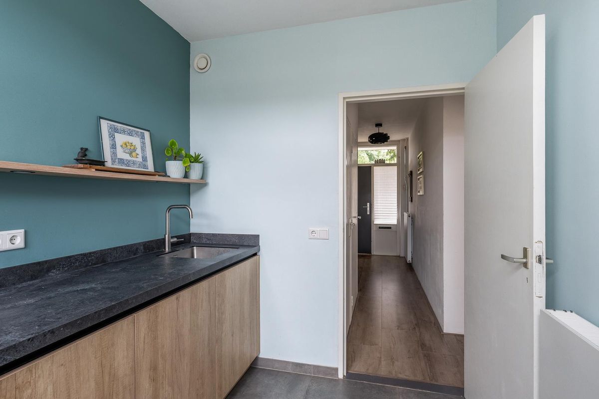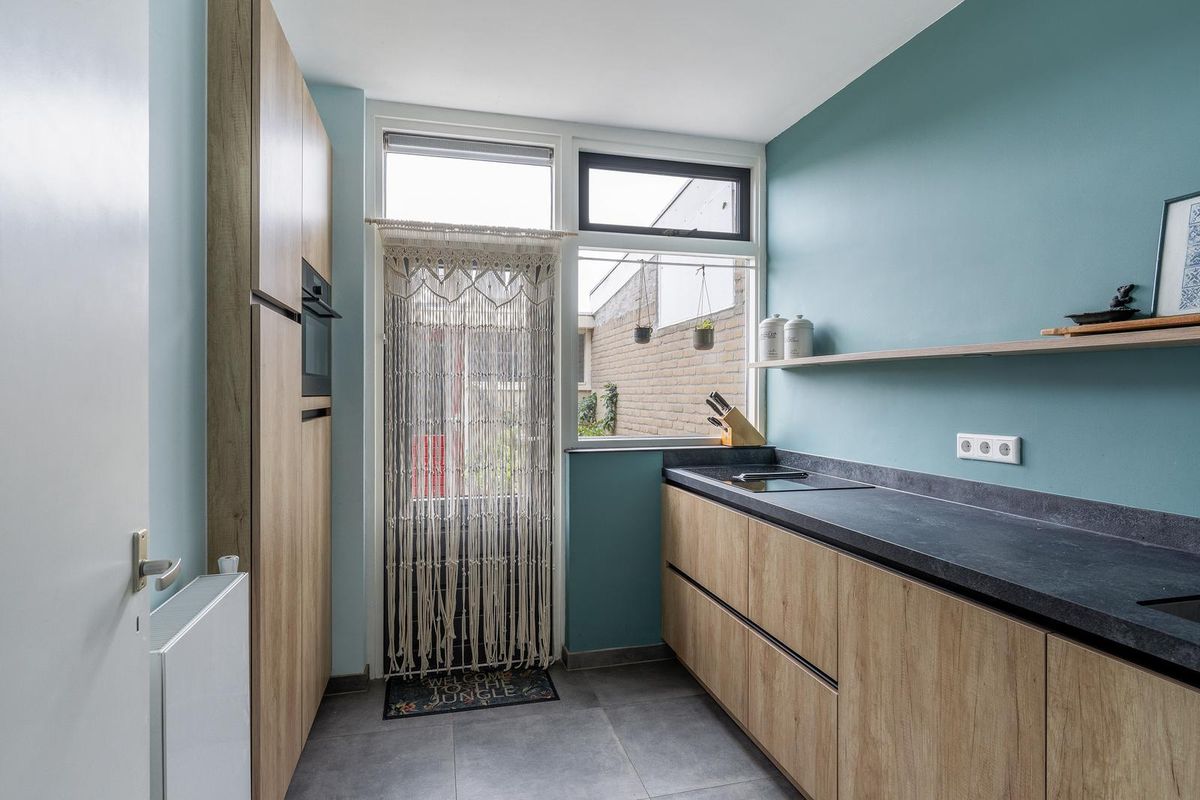 De keuken is in parallelopstelling geplaatst en uitgerust met een 4-groeps inductiekookplaat met geïntegreerde afzuiging, combi-ovenmagnetron, koelkast, vaatwasser en een spoelbak. Tevens is er een achterdeur naar de tuin.