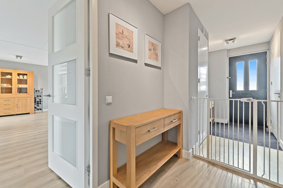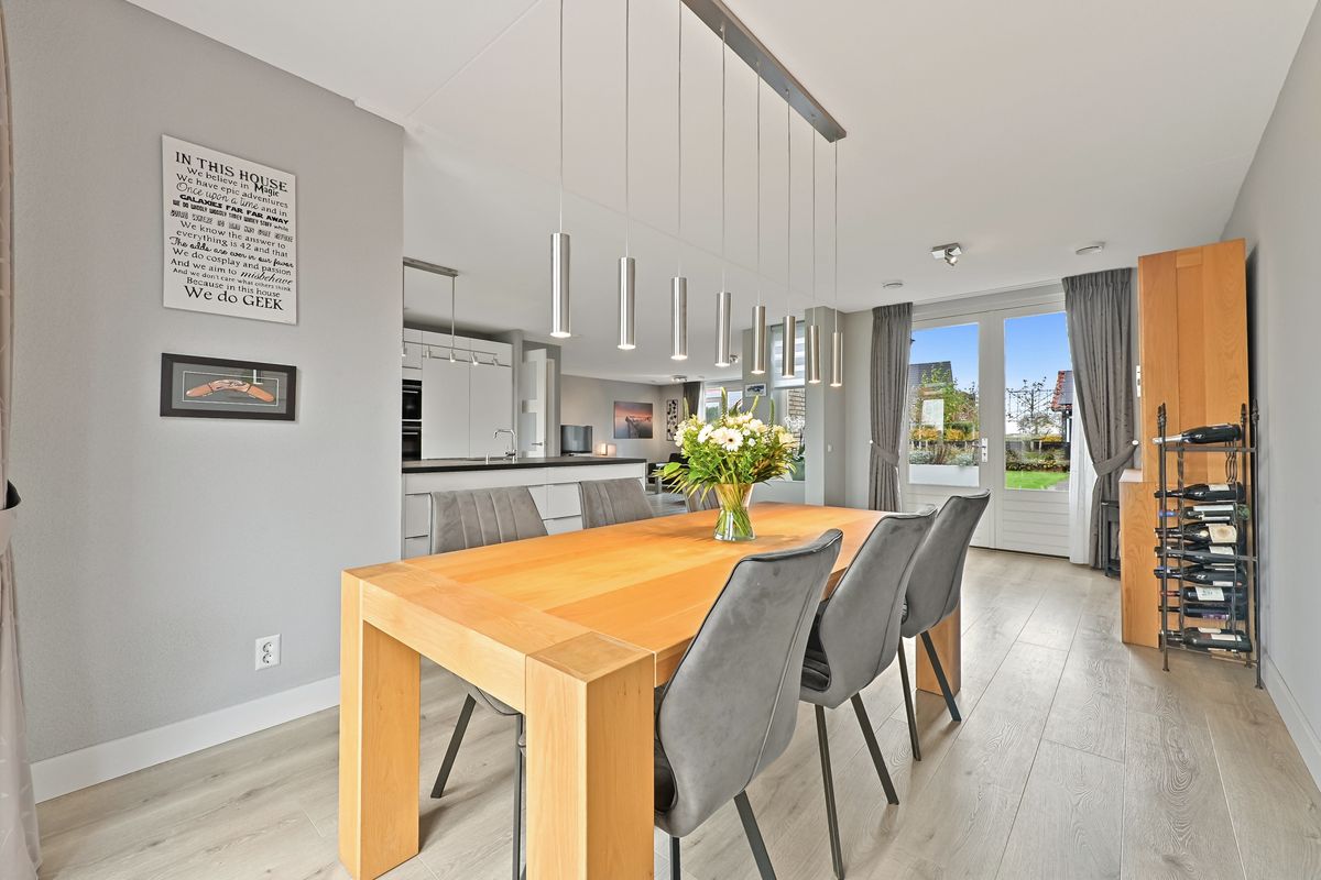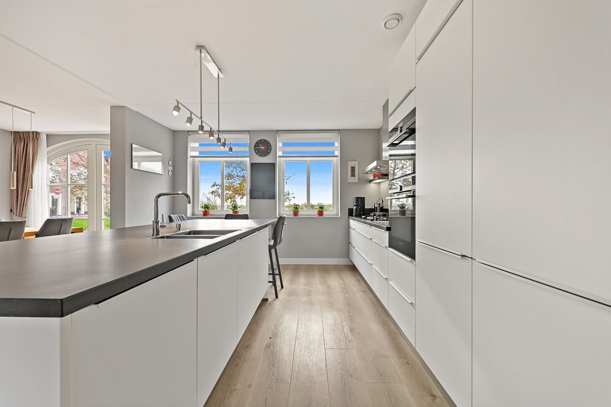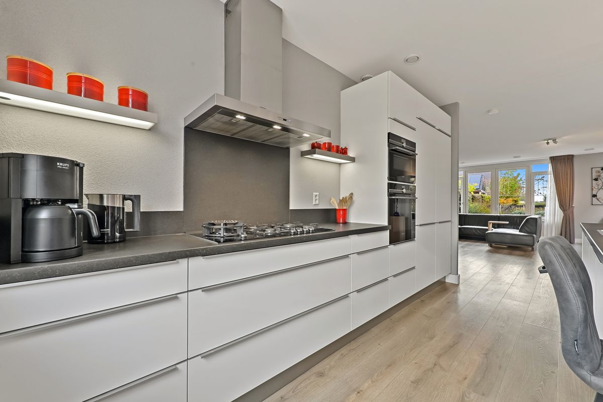 In de ruime representatieve hal zijn de meterkast, het toilet, de trap naar de verdieping, garderoberuimte én een grote voorraadkast aanwezig. Vanuit de hal komen we in de leefruimtes. De woonkeuken is aan de voorzijde van de woning gesitueerd. Deze zeer luxe uitgevoerde keuken met onder andere een centraal kook- en spoeleiland is voorzien van luxe inbouwapparatuur. Hierbij is door de huidige bewoners gekozen voor een hoge kwaliteit. Samen met de eetkamer is van de keuken een zeer grote, fijne ruimte gemaakt. Vanuit de kenmerkende raampartij aan de voorzijde heeft u fraai uitzicht op de lommerrijke vijver en aan de achterzijde kijkt u via de dubbele deuren naar de riante achtertuin. Aan de achterzijde van de woning is de woonkamer. De sfeervolle woonkamer is op diverse manieren in te delen en dankzij de dubbele deuren aan de achterzijde is het vanuit deze ruimte heerlijk om te genieten van het uitzicht op de riante achtertuin. De gehele begane grond is voorzien van een comfortabele vloerverwarming.