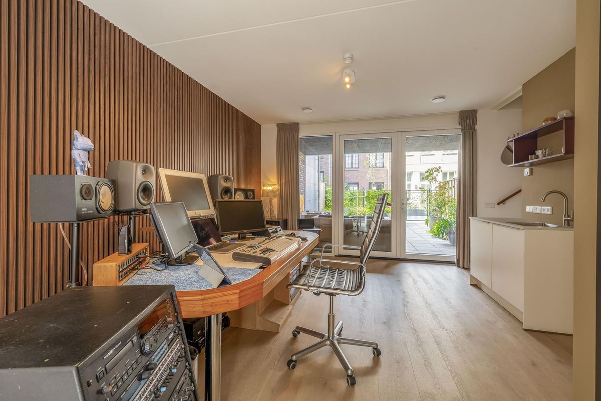 De kamer (ca. 20m²) op de begane grond is momenteel in gebruik als muziekstudio, echter kan deze ook uitstekend dienen als bijvoorbeeld werkkamer, hobbykamer, of speelkamer. Er zijn een toilet met fonteintje en een keukenblok met spoelbak, koelkast en elektrische boiler aanwezig. De openslaande deuren bieden toegang tot de achtertuin en overdekt terras.