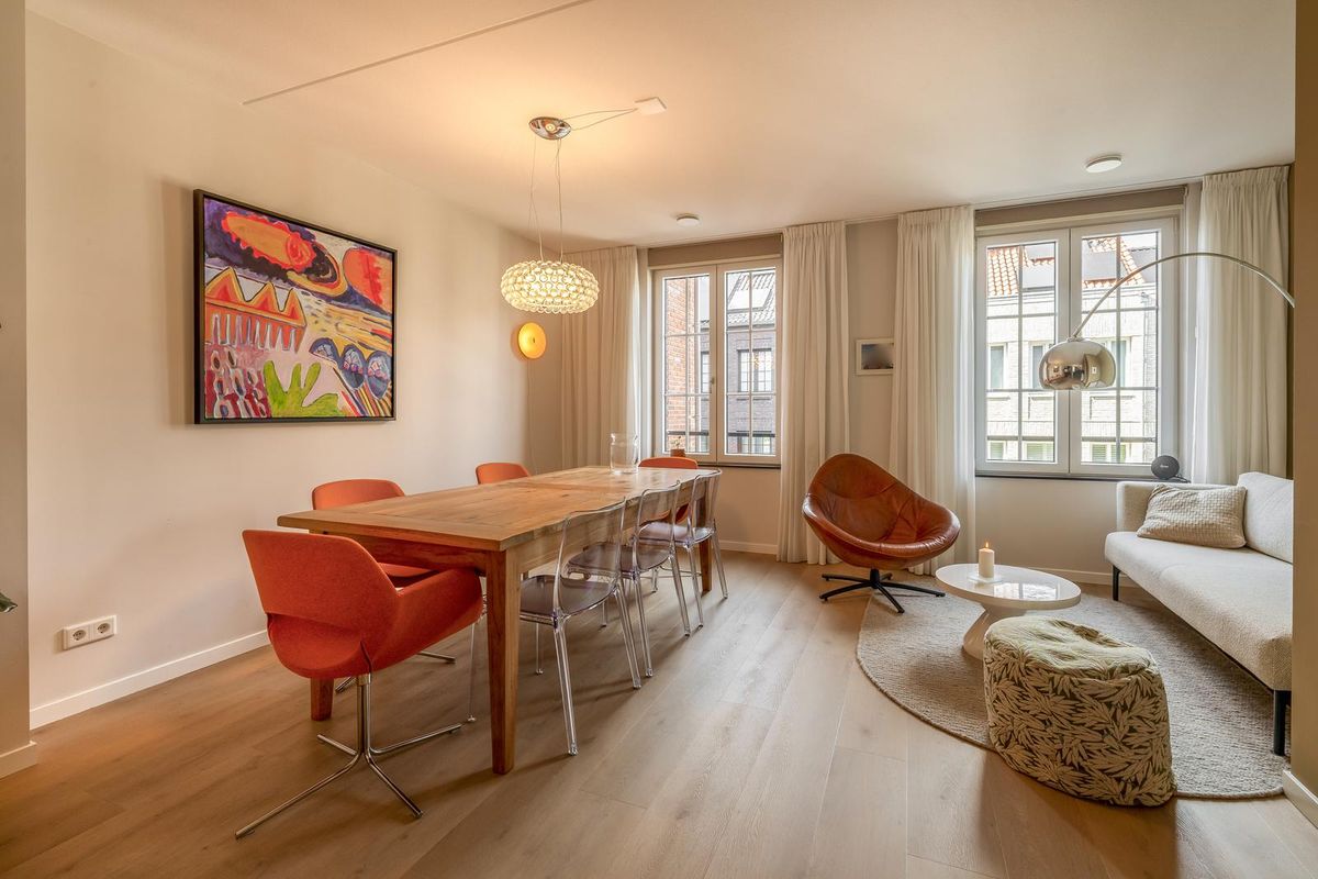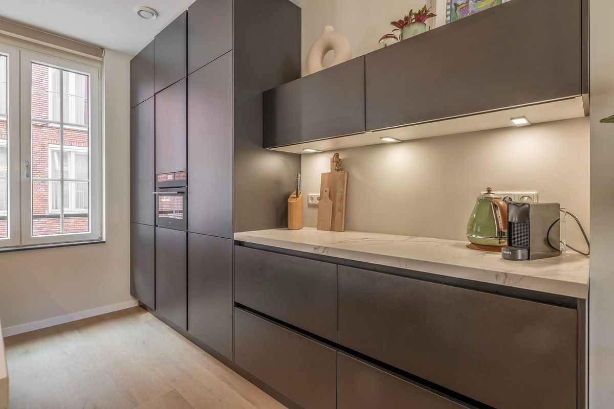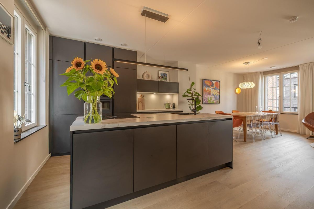 De eerste verdieping is voorzien van de woonkamer met open keuken. Het is één grote ruimte (ca. 41m²) die veel natuurlijke lichtinval heeft. De keuken is uitgerust met een inductiekookplaat met geïntegreerde afzuiging, een vaatwasser, koelkast, diepvries en combi oven/magnetron.