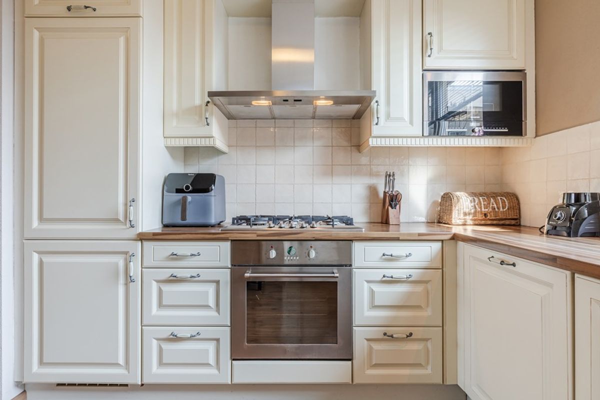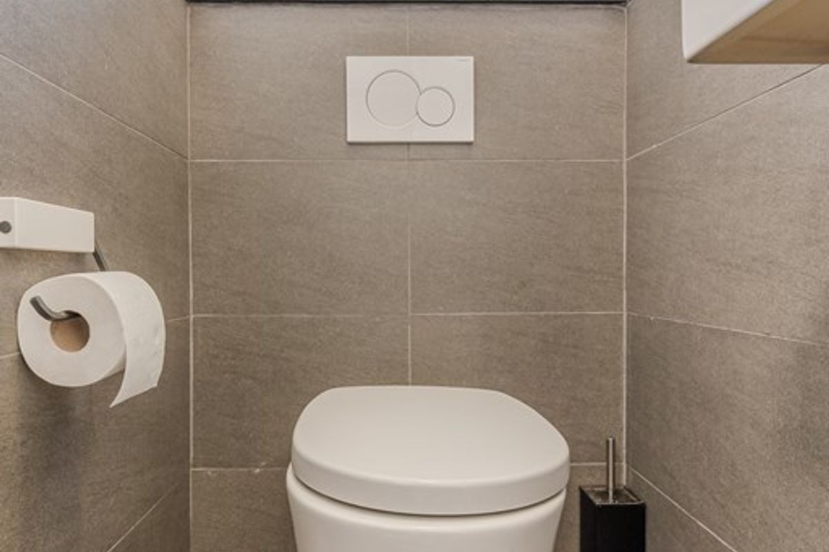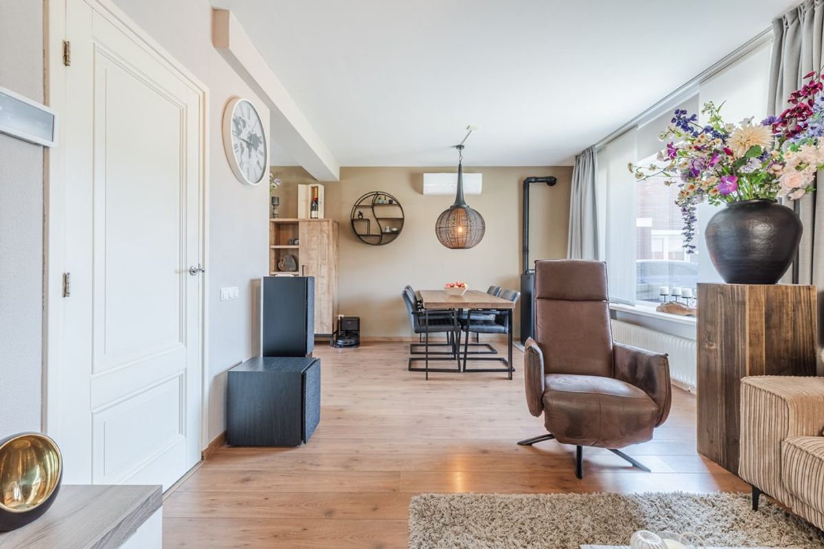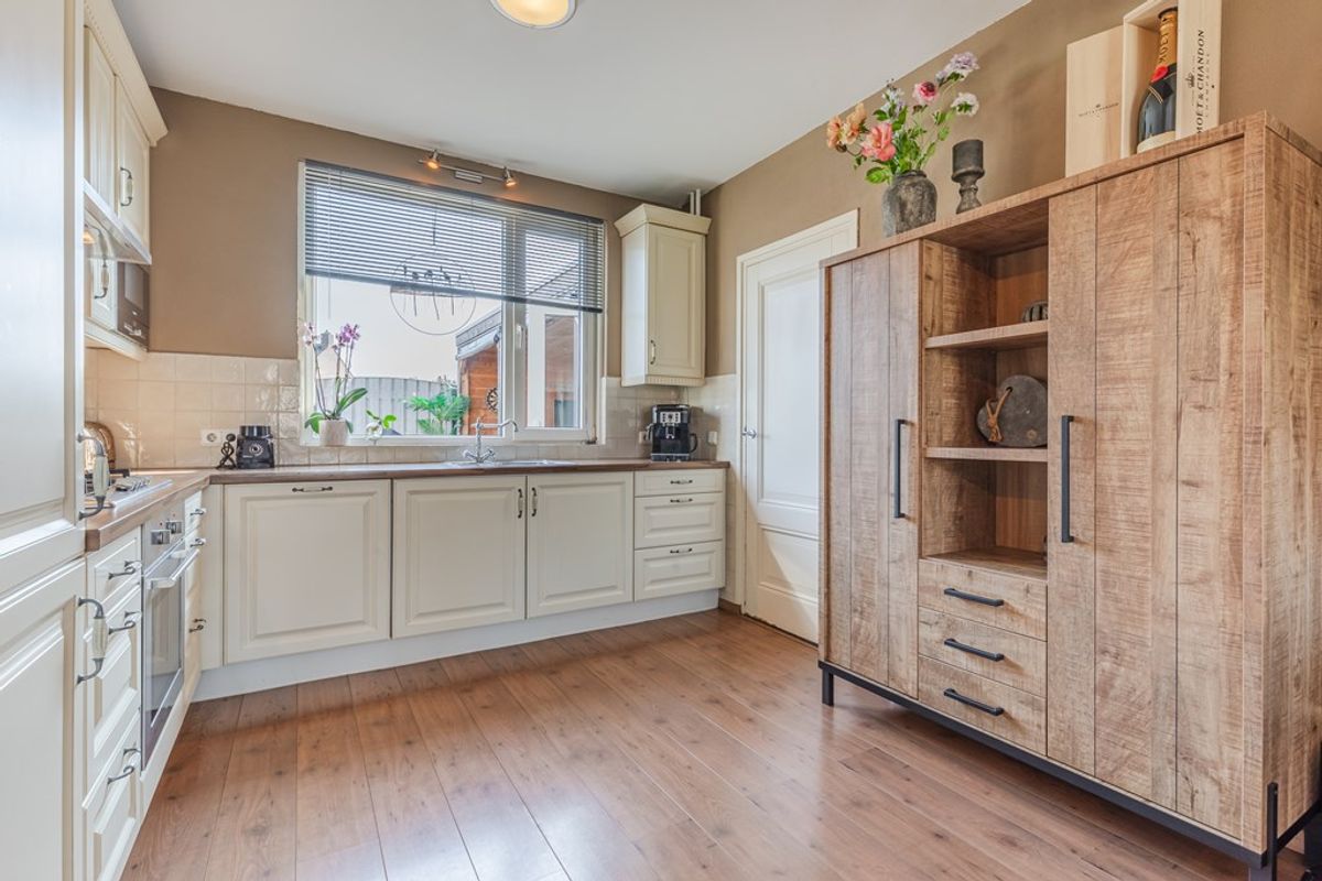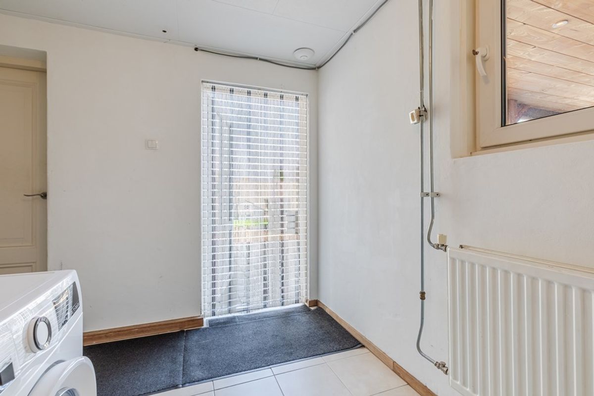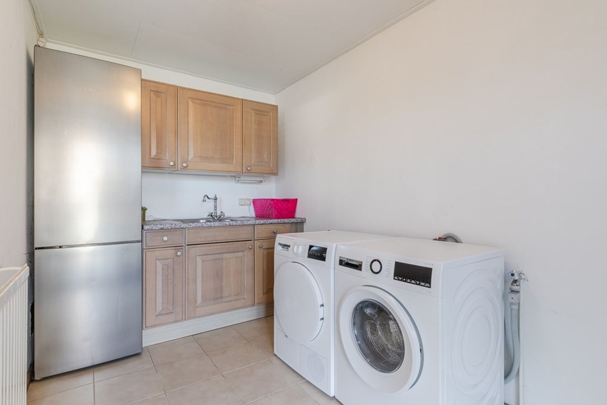 Hal (6 m²), modern zwevend toilet met fonteintje, woonkamer (23 m²) met laminaatvloer, airconditioning en pelletkachel, open keuken (9 m²) met een complete keukenopstelling v.v. een gaskookplaat, afzuigkap, oven, magnetron, koelkast, diepvries en vaatwasser, praktische, ruime bijkeuken (9 m²) met tegelvloer, keukenblok en aansluiting voor wasmachine, inpandige garage (18 m²).