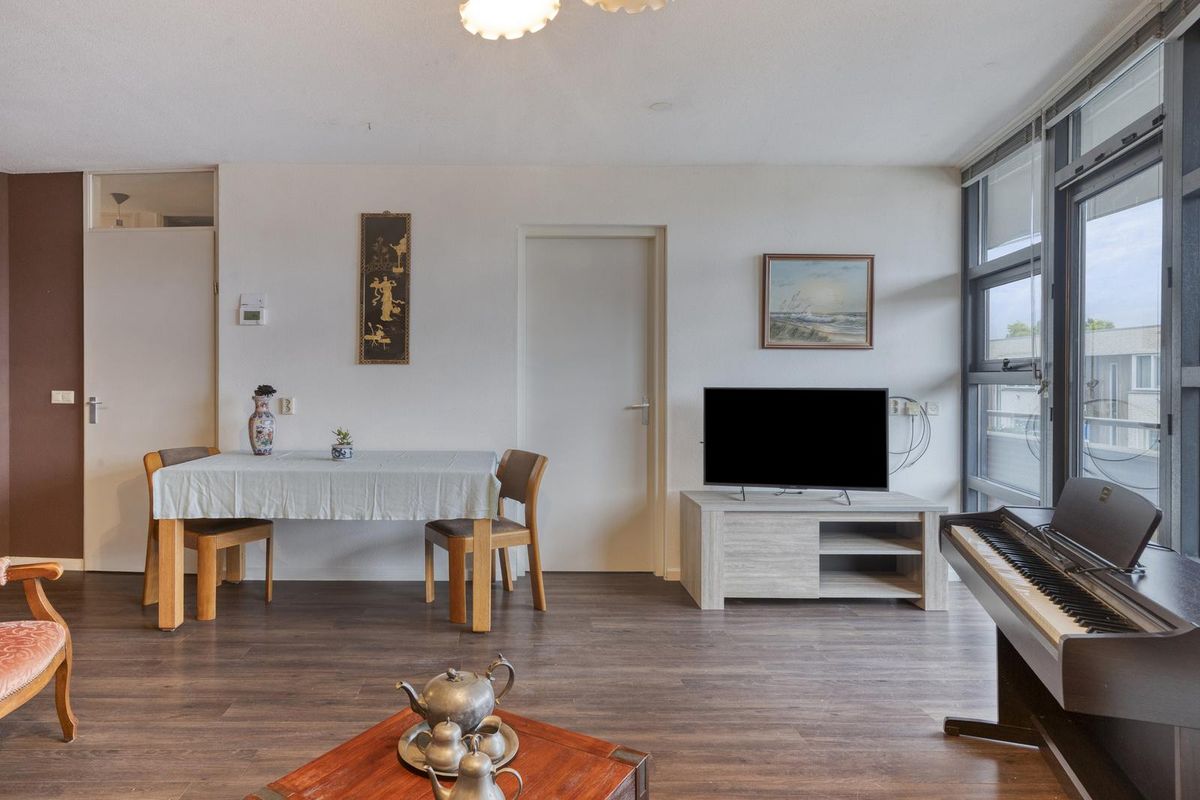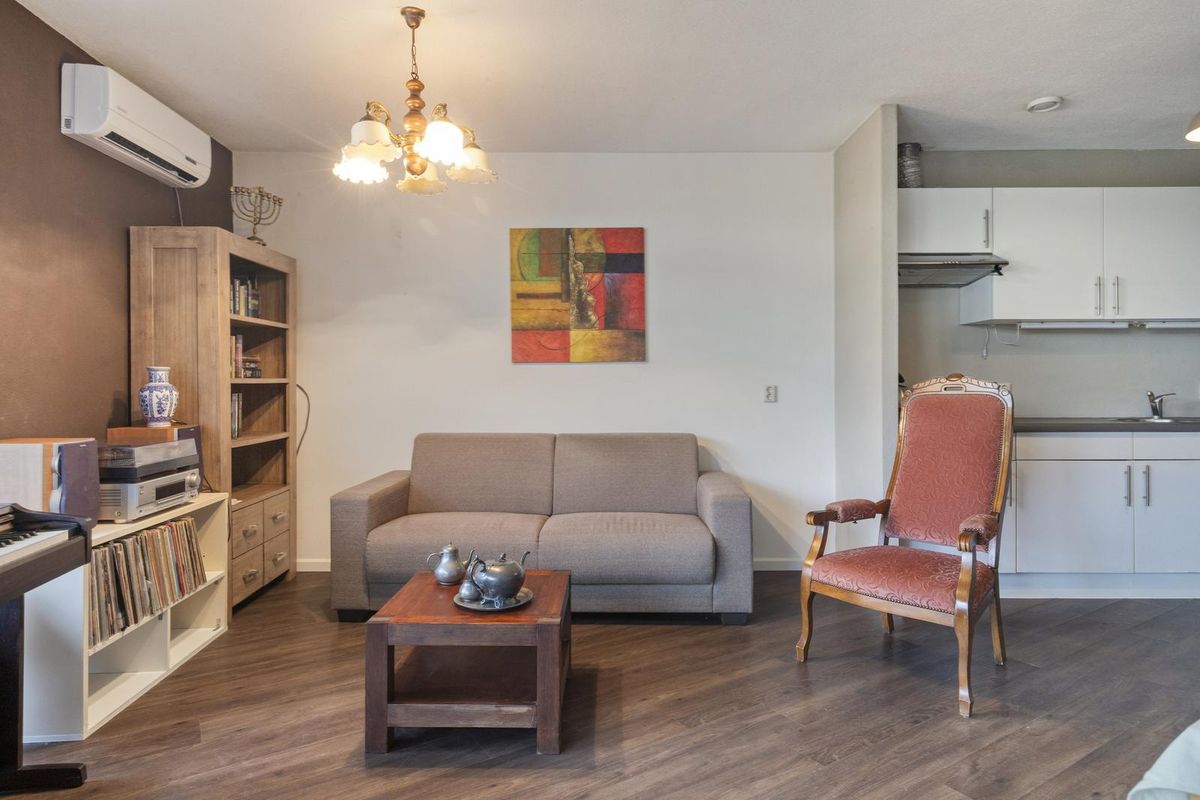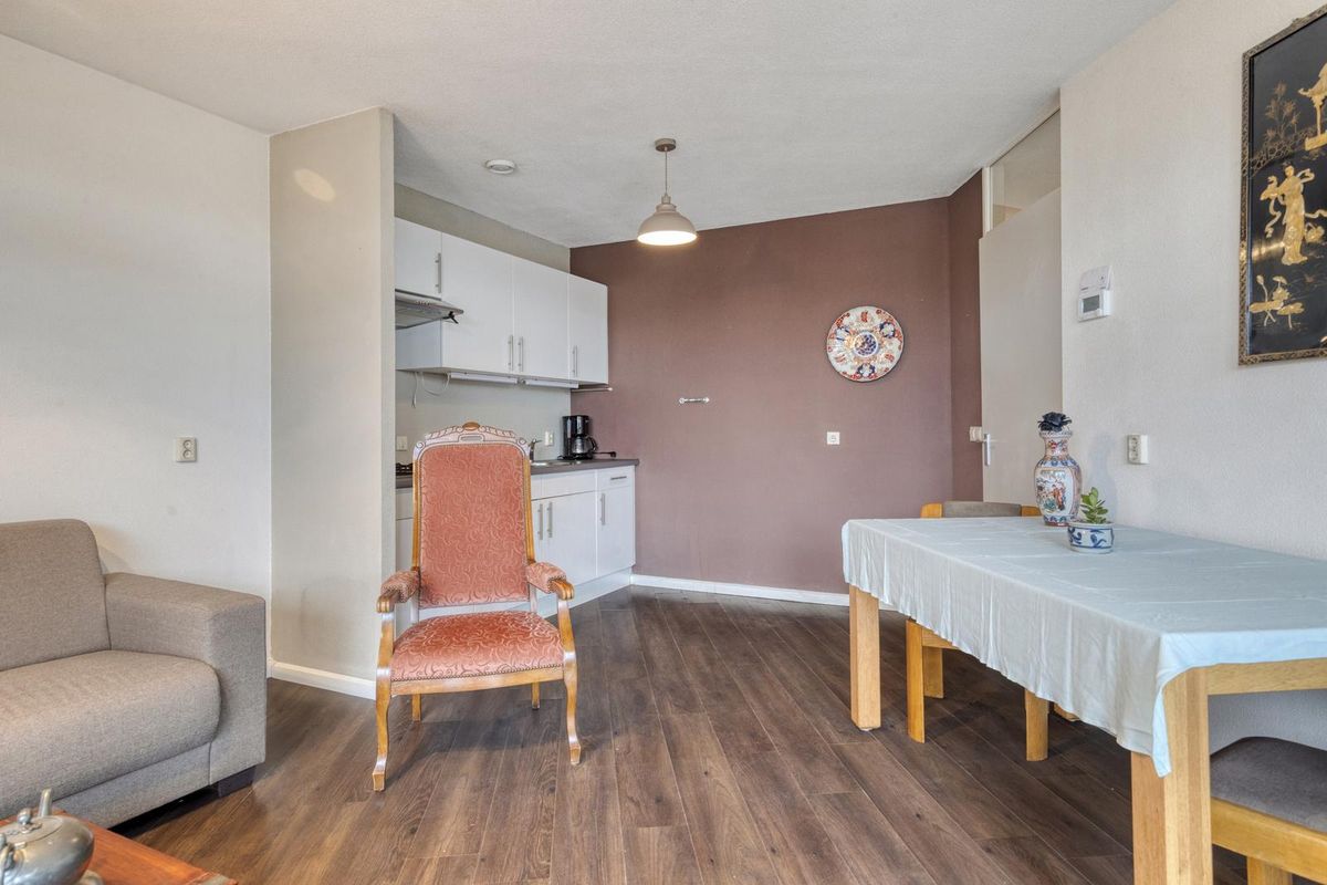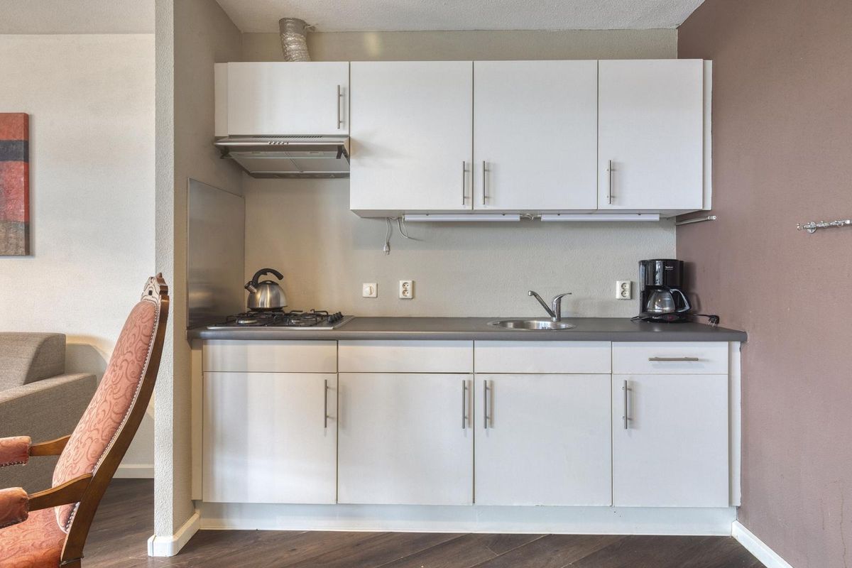 De woonkamer is sfeervol en licht, met een warme vloer die direct een knusse uitstraling geeft. Dankzij de grote raampartijen en de deur naar het balkon geniet je hier van volop daglicht. Er is ruimte voor een fijne zithoek, en hoewel de eethoek wat compacter is, nu ingericht met een gezellige tweepersoonstafel, ademt de ruimte een heerlijke, huiselijke sfeer. Extra pluspunt: de airco zorgt het hele jaar door voor een prettig binnenklimaat. De open keuken ligt aan één zijde van de woonkamer en is uitgevoerd in een nette witte kleurstelling. Voorzien van een gasfornuis en afzuigkap vormt deze keuken een fijne plek om dagelijks te koken en gezellig te borrelen met uitzicht over het balkon.