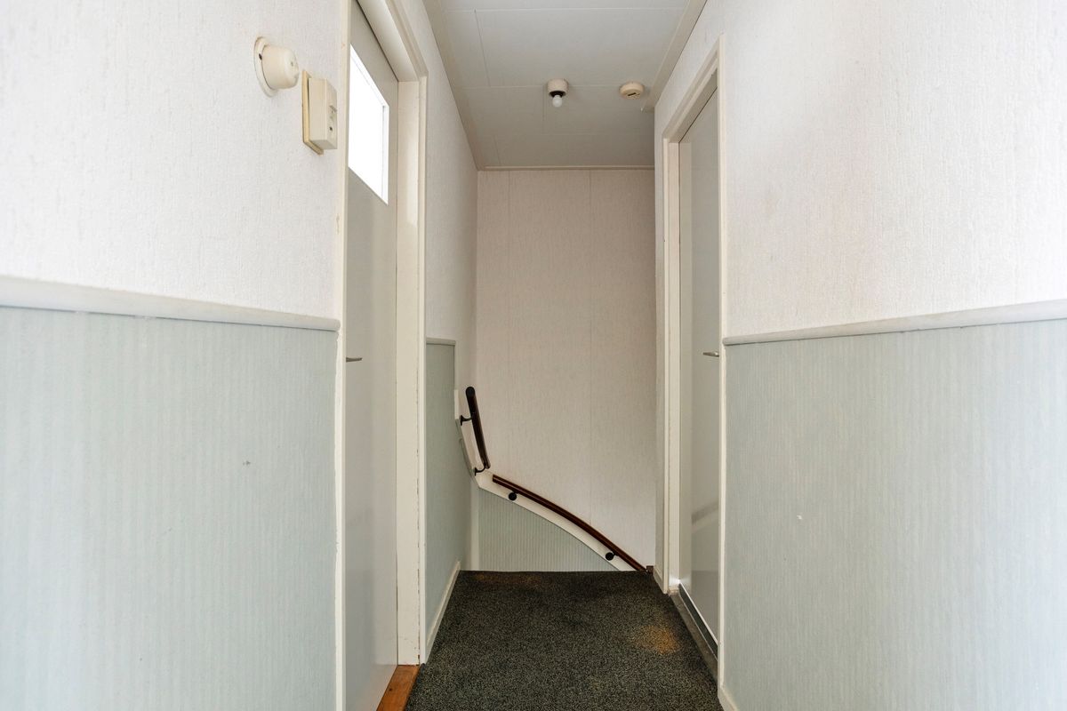 Entree/hal met trapopgang naar de eerste verdieping: toilet met fonteintje, kelderkast; meterkast; toegang tot de keuken. De keuken is gesloten en geeft zowel toegang tot de woonkamer als de tuin. De woonkamer is ruim te noemen en is zeer licht door de grote raampartijen aan de voor- en achterzijde van de woning.