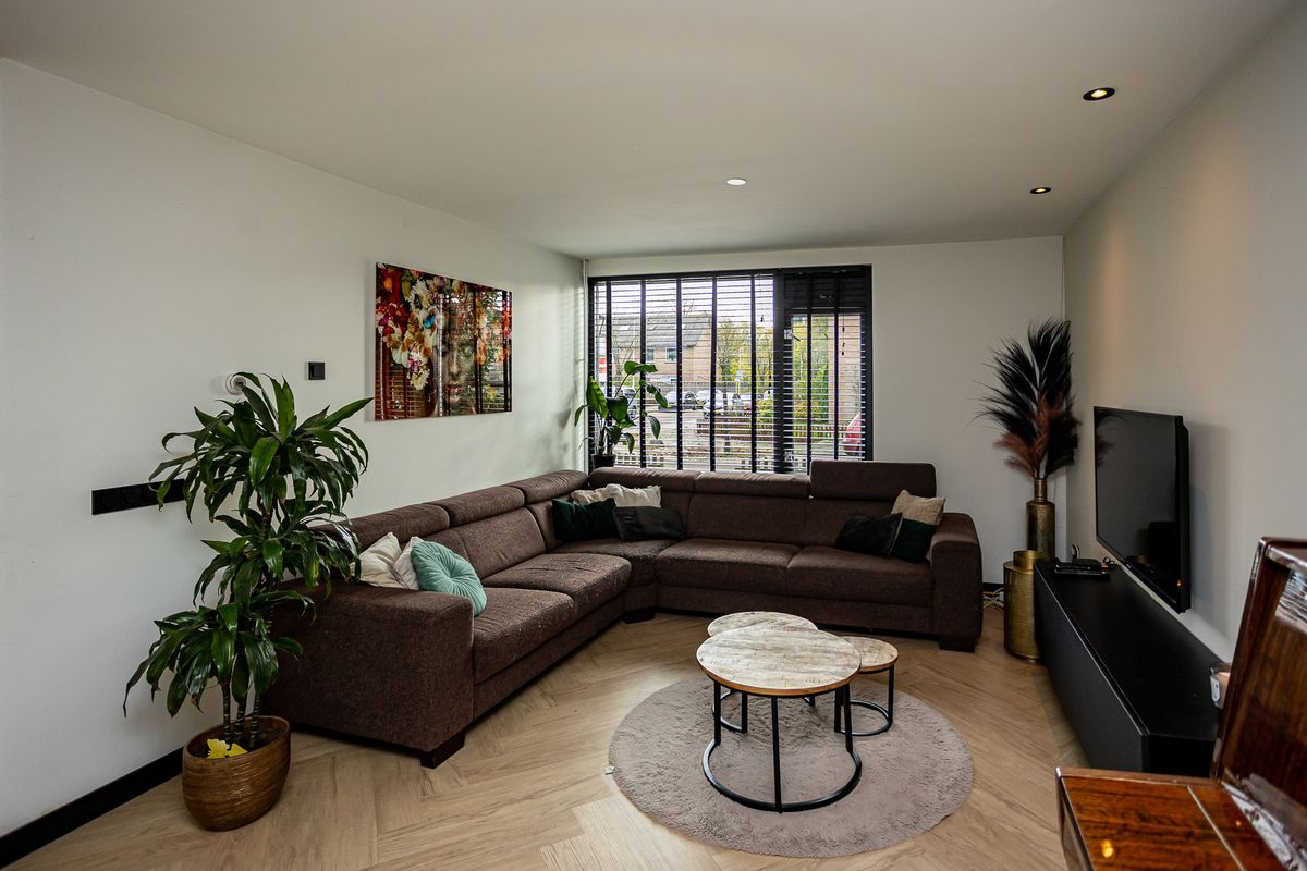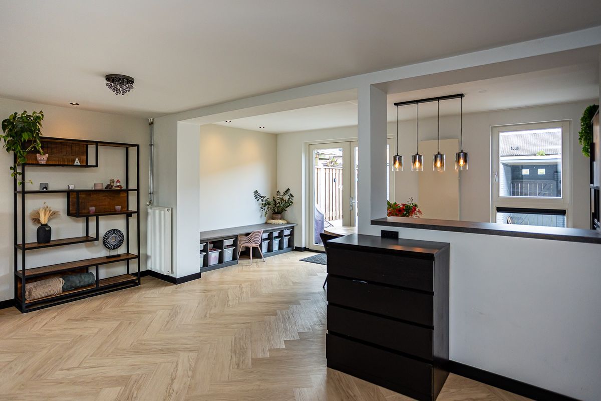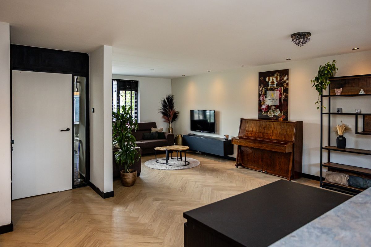 hal/entree, toilet met fontein, royale uitgebouwde (2024) eet-/woonkamer met PVC vloer en openslaande deuren naar terras en tuin, halfopen keuken met luxe moderne keukenblok (2018) in rechte opstelling met diverse inbouwapparatuur.