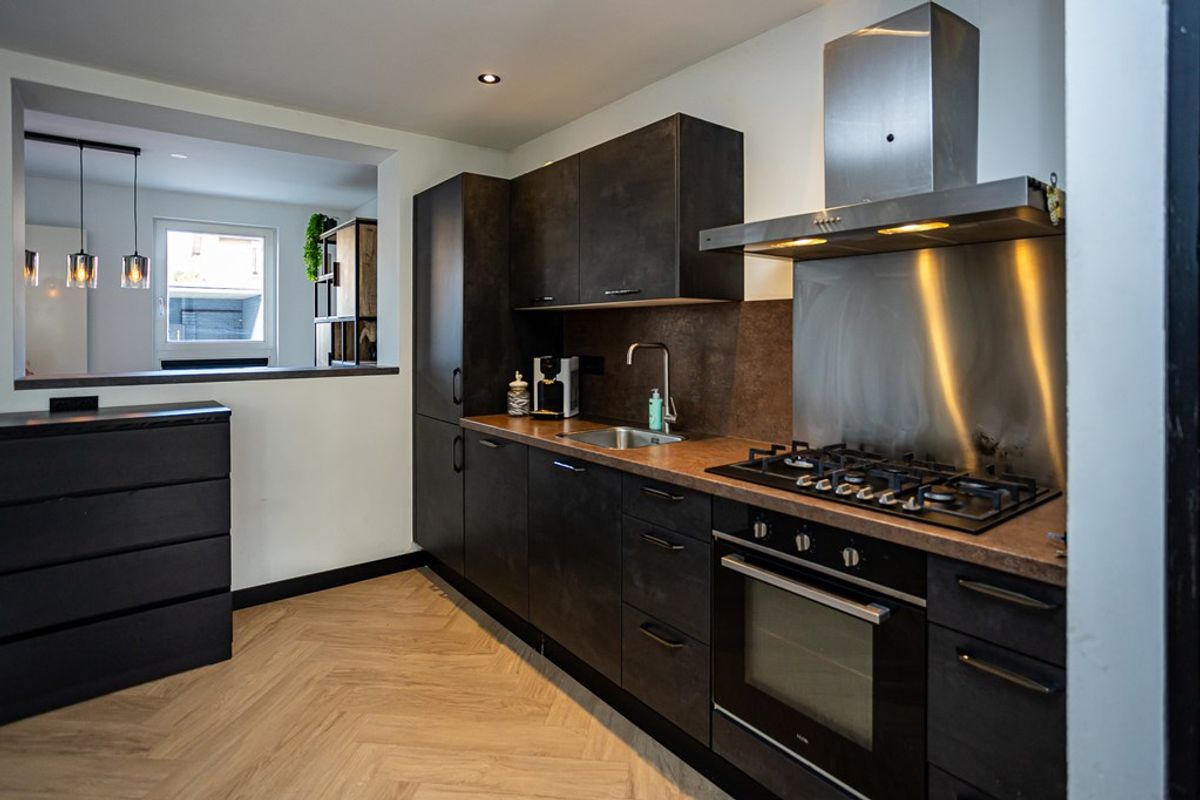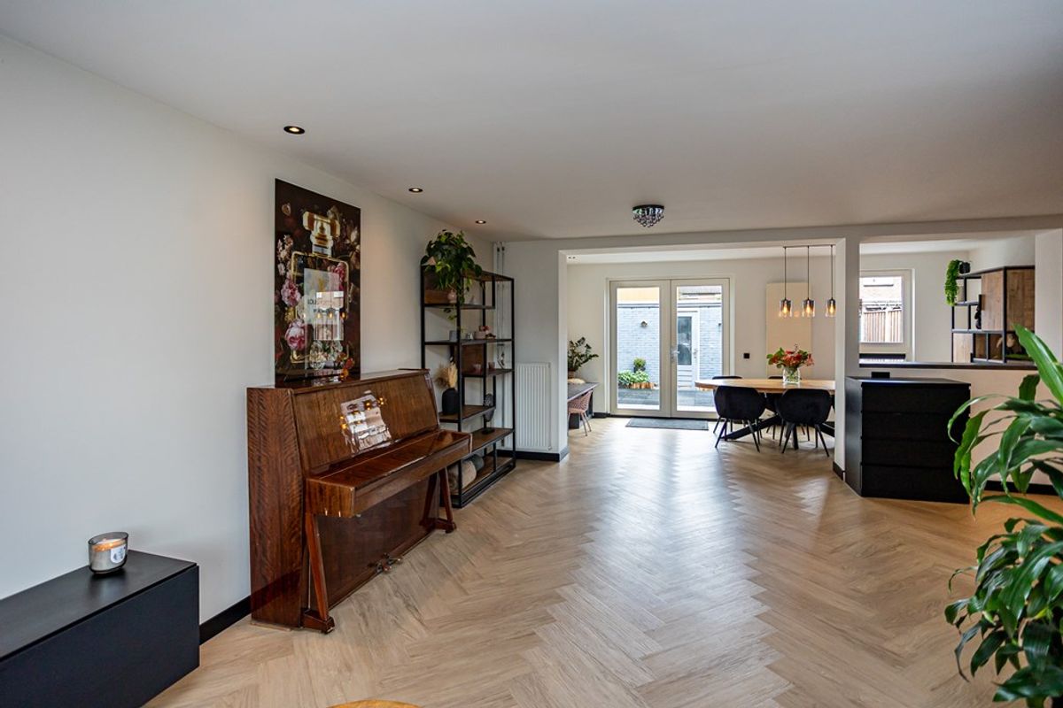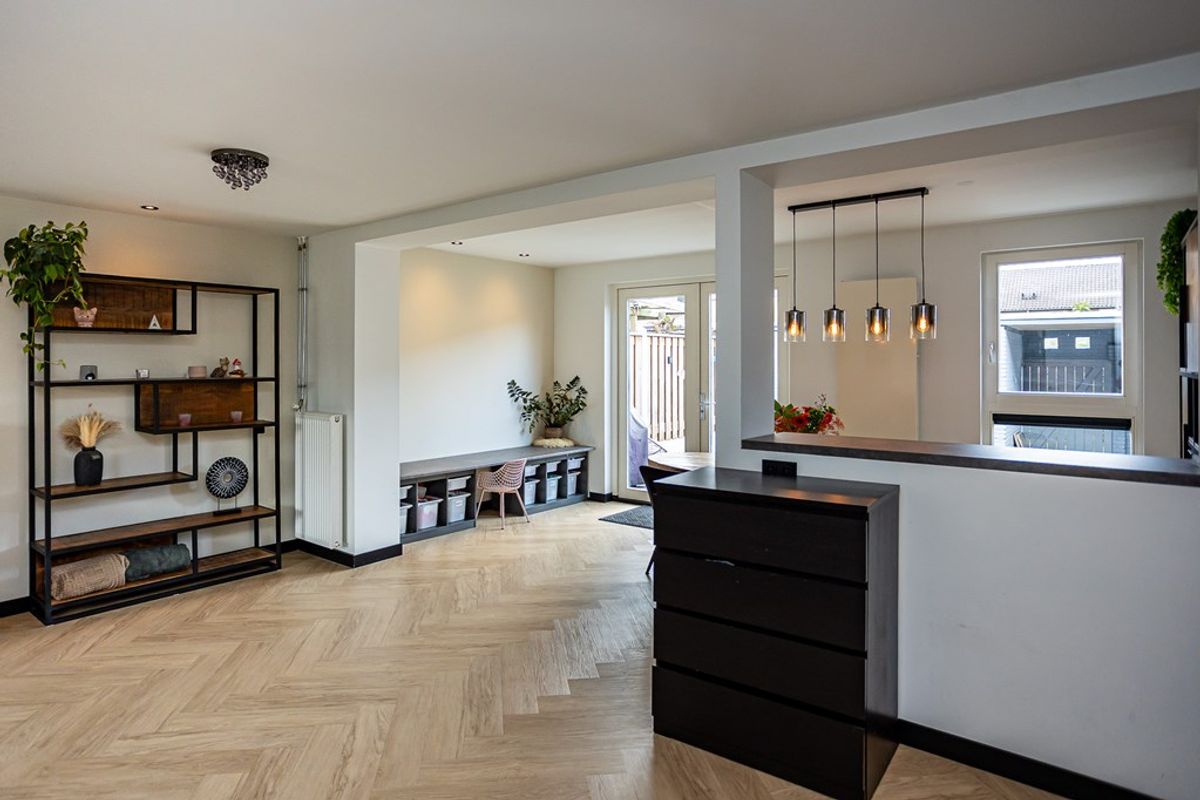 hal/entree, toilet met fontein, royale uitgebouwde (2024) eet-/woonkamer met PVC vloer en openslaande deuren naar terras en tuin, halfopen keuken met luxe moderne keukenblok (2018) in rechte opstelling met diverse inbouwapparatuur.