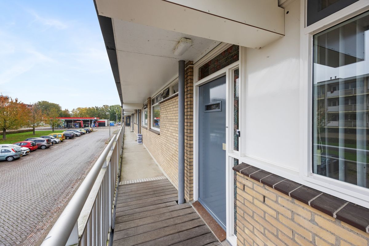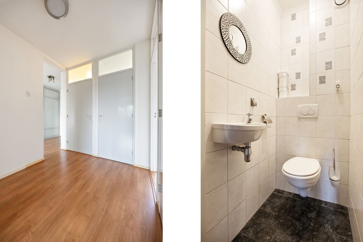 Via de centrale entree van het complex bereik je zowel de lift als het trappenhuis. Dat maakt het appartement geschikt voor zowel jonge starters als senioren. Via de galerij komen we bij de voordeur van het appartement. Direct bij binnenkomst is er plek voor de garderobe en vind je hier de meterkast. Van hieruit loop je door naar de hal, die de verschillende vertrekken overzichtelijk met elkaar verbindt.