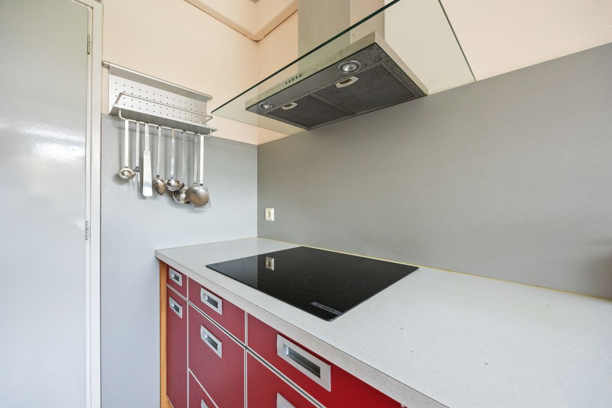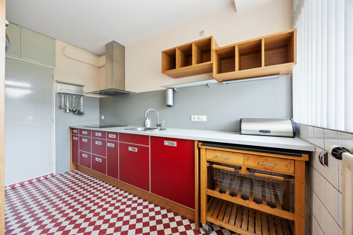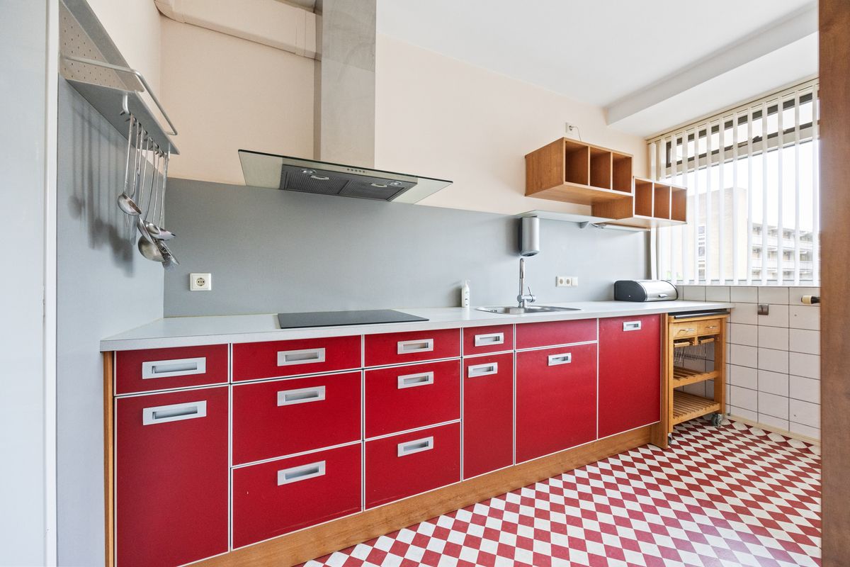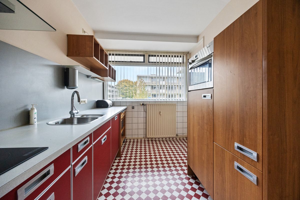 De keuken ligt aan de rechterzijde van de hal, aan de voorzijde van het appartement. Deze is ruim opgezet, met veel opbergruimte en afgesloten van de overige ruimtes. De keuken is voorzien van een vierpits keramische kookplaat met afzuigkap, vaatwasser, koelkast en combi-oven. Ten slotte zijn er twee handige inbouwkasten, zodat je keukengerei, apparatuur en voorraad netjes kunt opbergen.