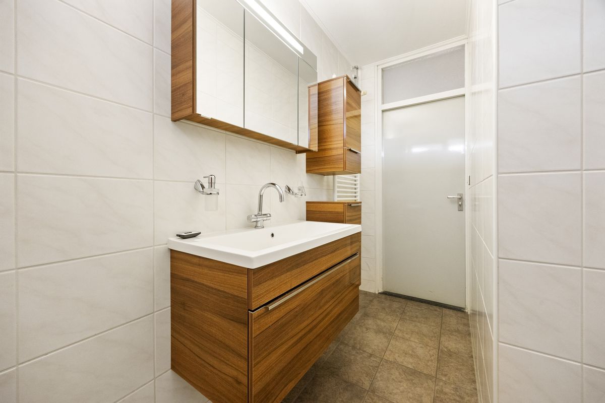 Tussen de kamers bevindt zich de badkamer met wastafelmeubel, ruime inloopdouche en designradiator. De aansluiting voor de wasmachine bevindt zich eveneens in de badkamer. De badkamer is momenteel ingericht met voorzieningen die het gebruik voor senioren of mensen met een lichamelijke beperking vergemakkelijken, maar biedt volop mogelijkheden om te moderniseren naar eigen smaak. Naast de badkamer is er nog een apart toilet, wat het wooncomfort vergroot en praktisch is bij bezoek.