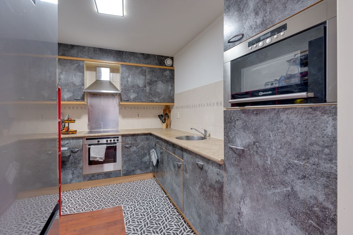 The semi-open kitchen is arranged in an L-shape and comes equipped with various built-in appliances such as a dishwasher, hob, extractor, oven, microwave, fridge-freezer combination, and a luxury mixer tap. Of course, there’s plenty of storage space.