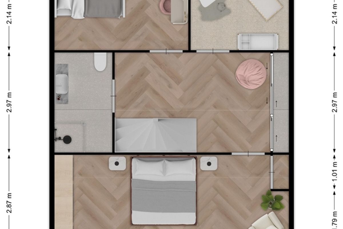 Op de eerste verdieping vind je drie slaapkamers: twee aan de voorzijde en de ruime master bedroom aan de achterzijde met een grote schuifpui naar het balkon. De moderne badkamer is voorzien van een inloopdouche, wastafelmeubel, toilet en mechanische ventilatie.