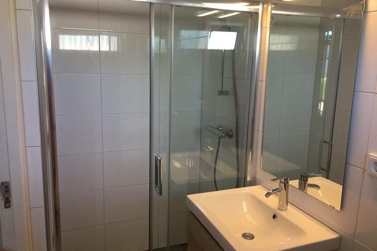 Aansluitend de geheel betegelde moderne badkamer (2018), ca. 1.26 x 2.89m, met douche, wastafel en witgoedaansluitingen.