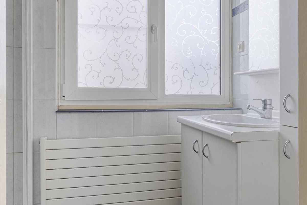 De lichte badkamer is voorzien van een douchecabine, wastafel met meubel en extra bergkasten. Compact, maar efficiënt ingericht. Voor ventilatie is er een te openen raam aanwezig.