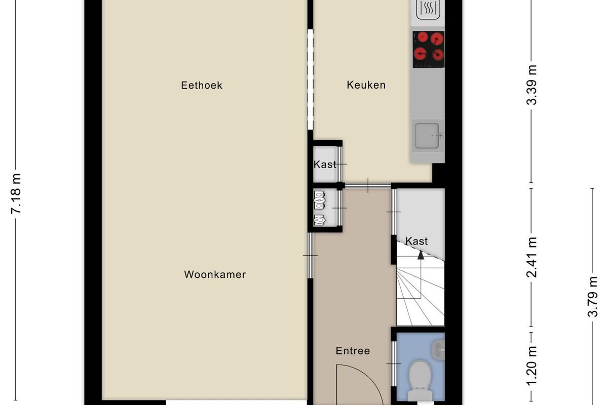 Via de onderhoudsvriendelijke voortuin bereik je de entree van de woning. De hal biedt toegang tot het toilet met fontein, de trapopgang naar de eerste verdieping, de trapkast, de meterkast en natuurlijk de woonkamer en keuken.