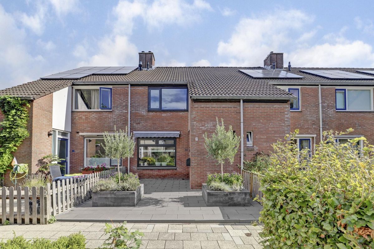 De voortuin is strak bestraat met verhoogde plantvakken en een zonnescherm bij het voorraam, heerlijk voor de middagzon.