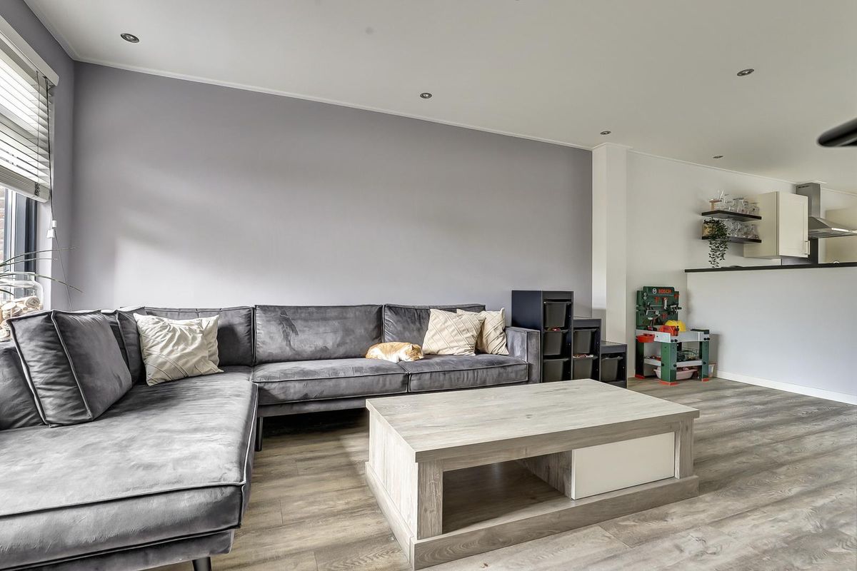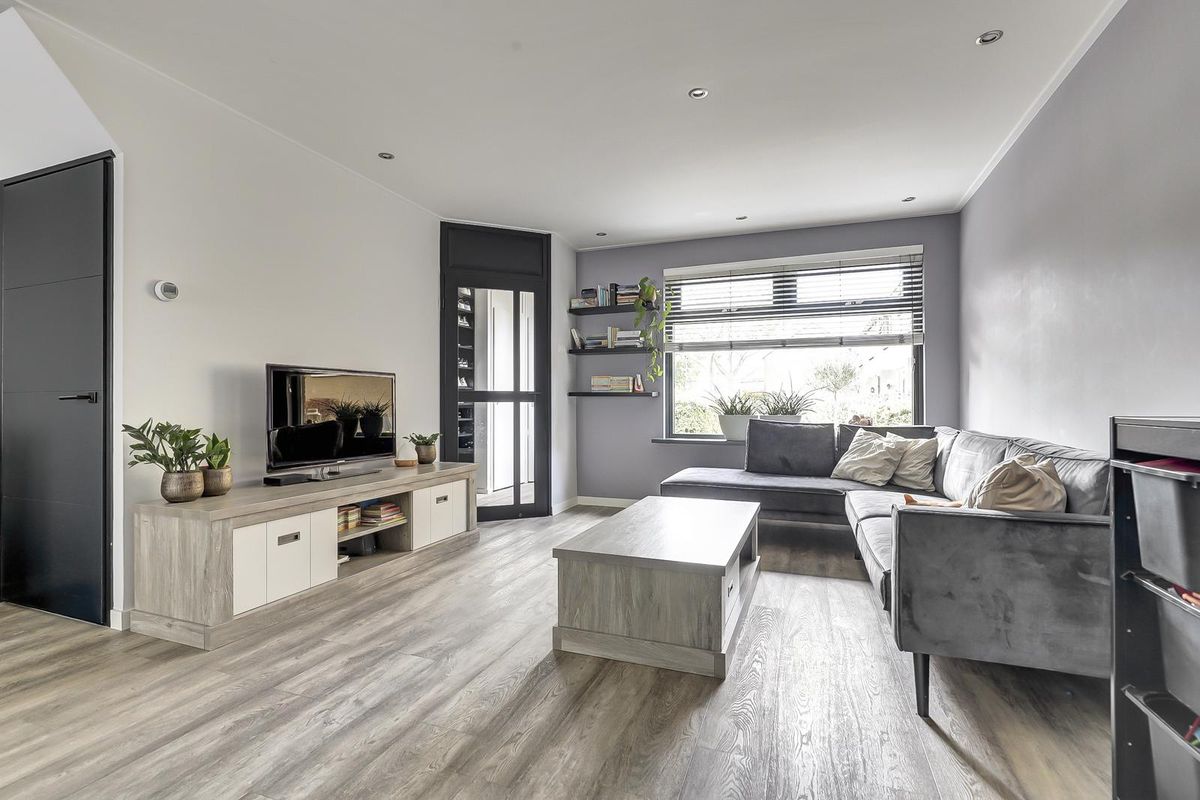 De woonkamer is heerlijk licht door het grote raam aan de straatzijde en de neutrale wandkleuren. De strakke houtlook vloer loopt drempelloos door en de inbouwspots in het gladde plafond zorgen voor een moderne uitstraling.