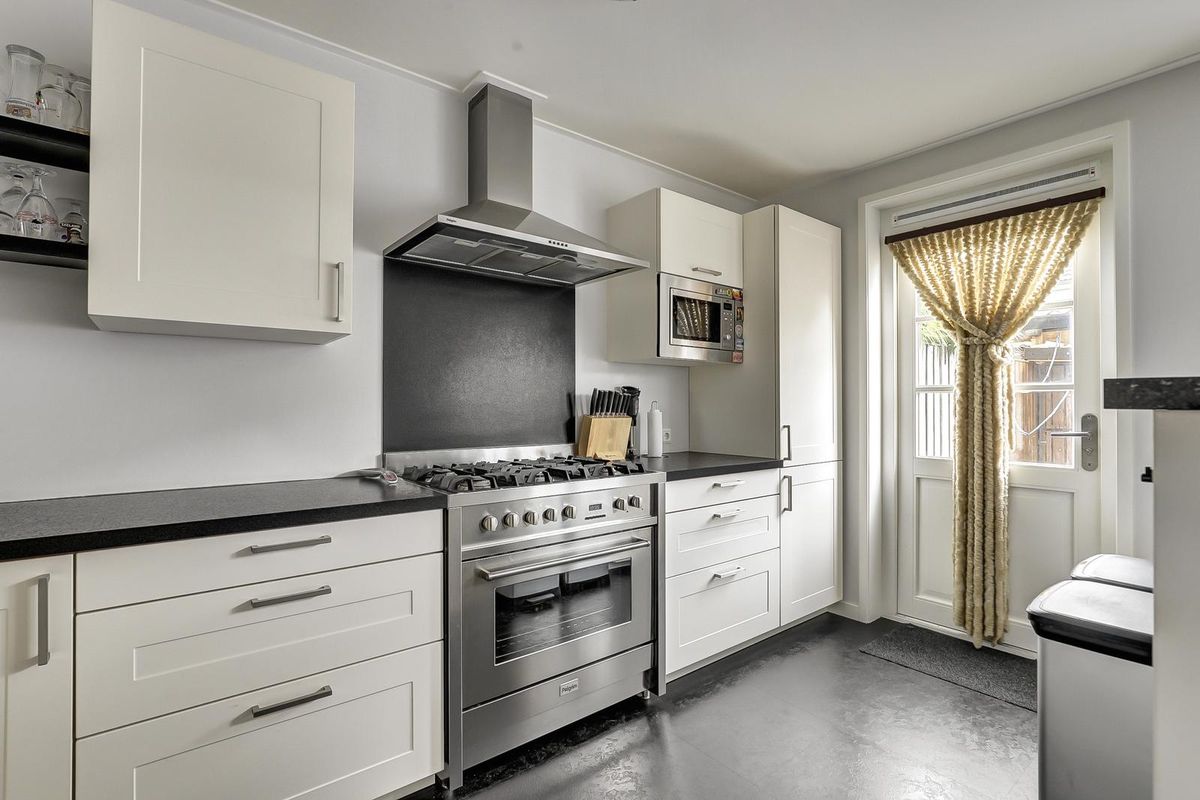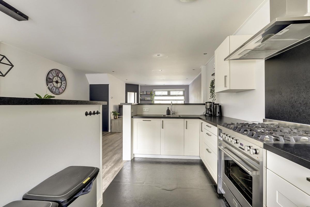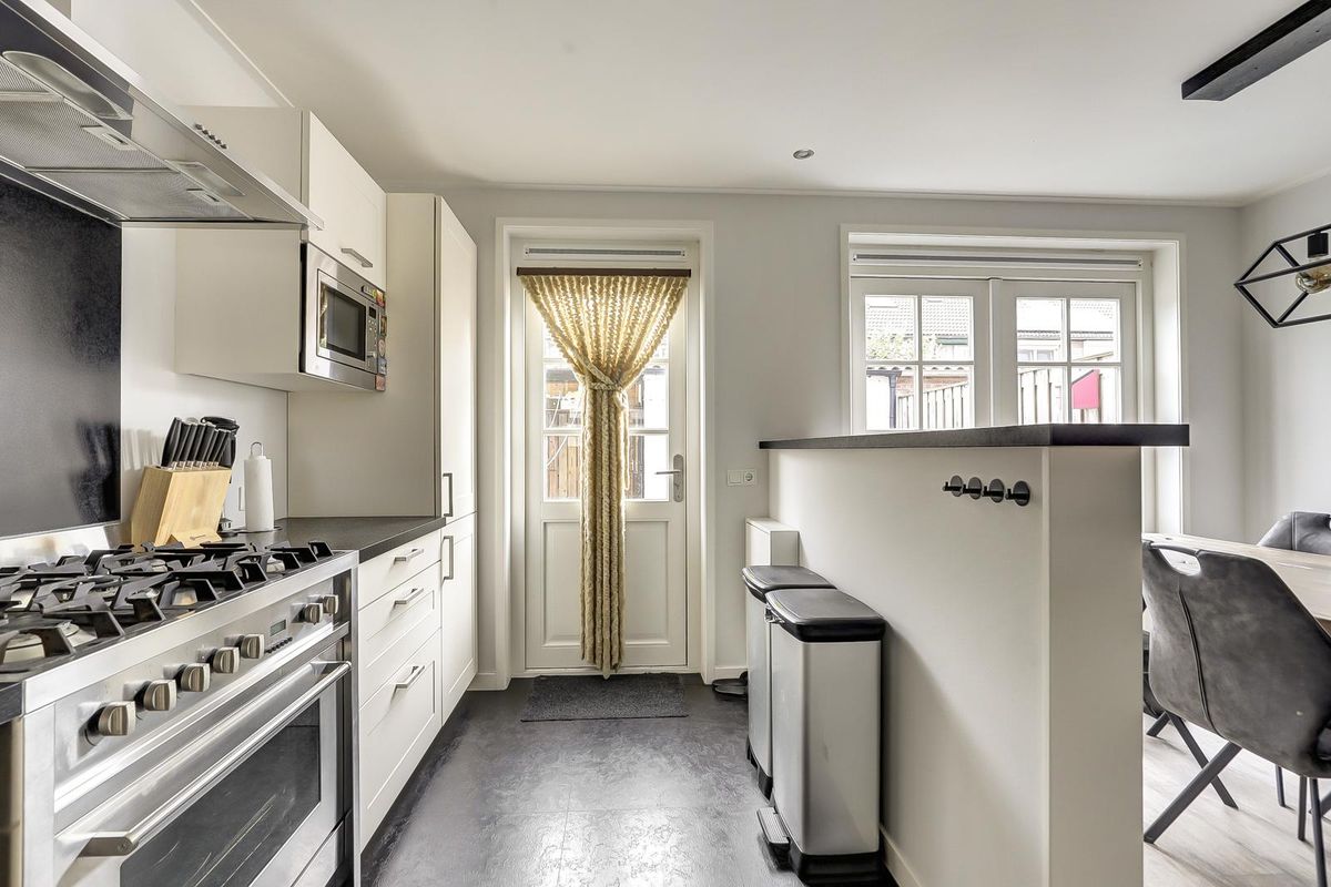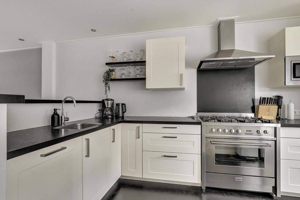 Aan de achterzijde ligt de halfopen keuken met lichte fronten, strakke grepen en donkere werkbladen. De keuken is deels afgescheiden van de woonkamer door een halfhoge muur, waardoor deze een eigen plek heeft maar toch in open verbinding staat met de eetruimte. Blikvanger is het brede rvs-fornuis met oven en rvs-schouw. Verder ziet u een spoelbak, praktische open planken en een ingebouwde magnetron. In de eetruimte is royaal plek voor een grote tafel, via dubbele tuindeuren stapt u zo de achtertuin in. Een trap-/voorraadkast biedt extra bergruimte.