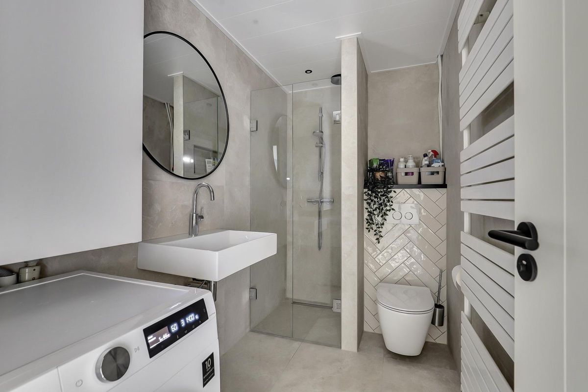 • Moderne badkamer met inloopdouche, zwevend toilet en wasmachine-opstelling