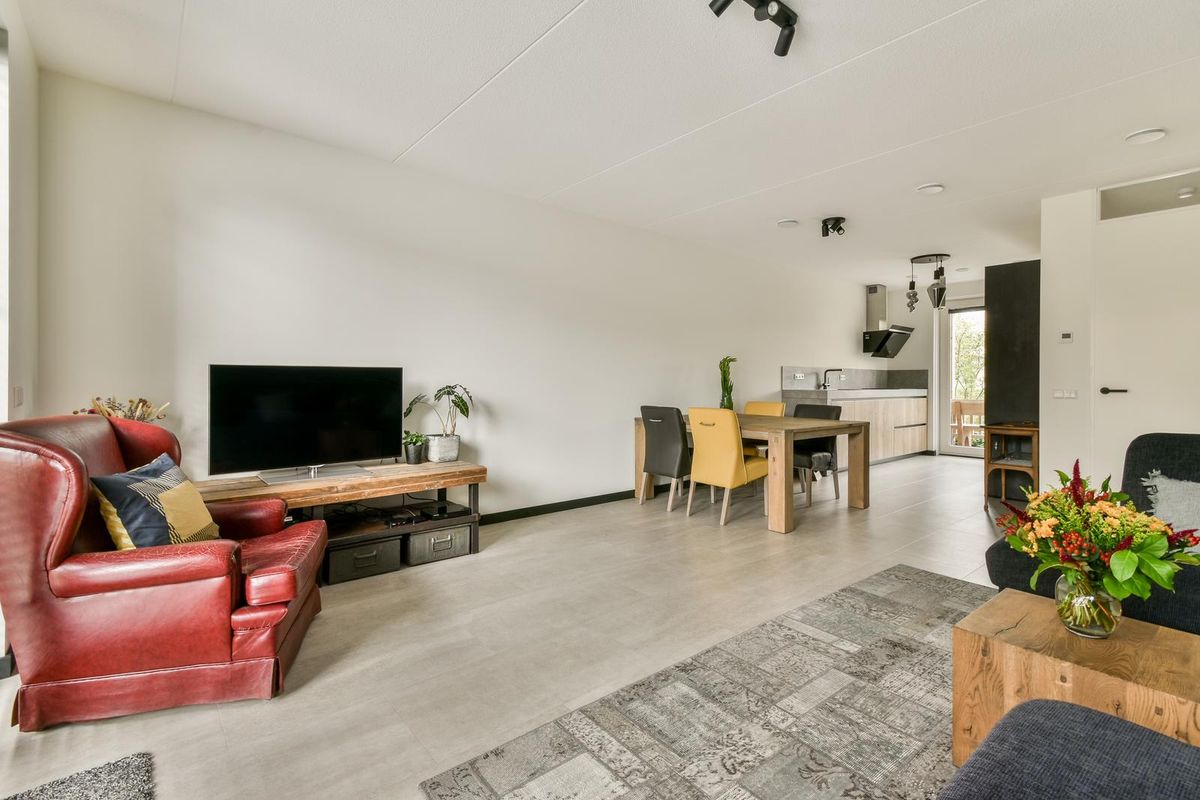 Voortuin met pergola en toegang tot de woning. Entree/hal met meterkast, vaste kast met warmtepompinstallatie, volledig betegeld toilet v.v. wandcloset en fonteintje, trapopgang en toegang tot de woonkamer. De woonkamer kijkt uit op de tuin en is voorzien van een trapkast. Dankzij de hoge raampartijen geniet je van veel licht en een ruimtelijk gevoel. Aan de voorzijde ligt de open keuken. De keuken is modern afgewerkt met een apparatenwand en een keukenblok. De keuken is uitgerust met een koel-vriescombinatie, een vaatwasser, een combi-oven, een inductiekookplaat en een afzuigkap (wandschouw). De gehele begane grond beschikt over een PVC-vloer met vloerverwarming en -koeling.