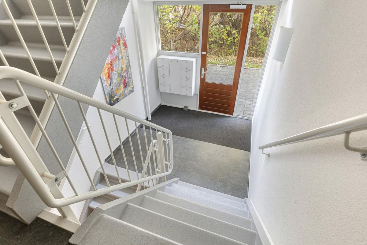 In de algemene entree zijn de brievenbussen en een bellentableau. Vanuit deze entree van het appartementencomplex is er toegang tot de lift, het trappenhuis en de bergingen.