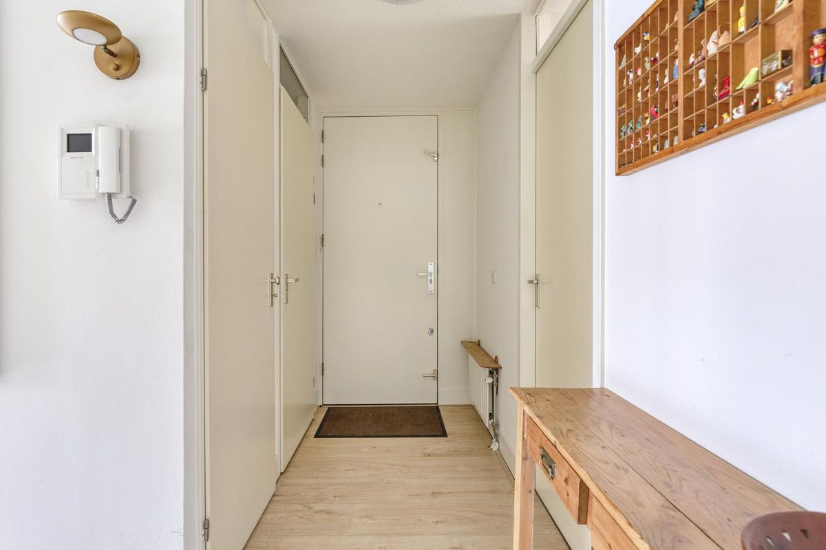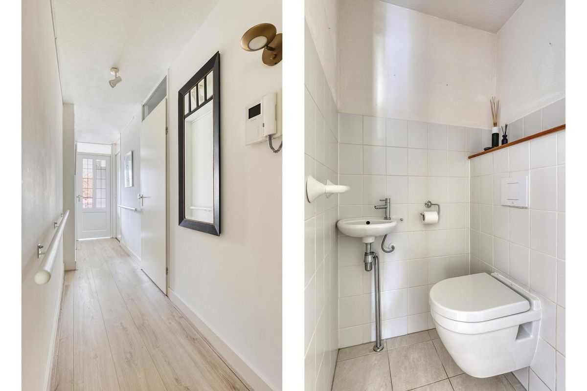De entree (met de meterkast en de video-intercominstallatie) geeft toegang tot de woonkamer, de eetkamer, de twee slaapkamers, de badkamer, de toiletruimte en de inpandige berg-/wasruimte.