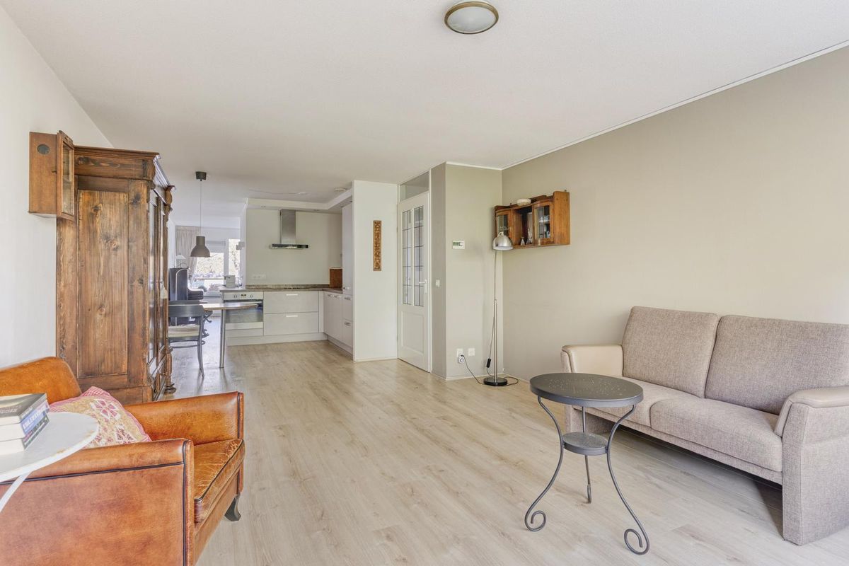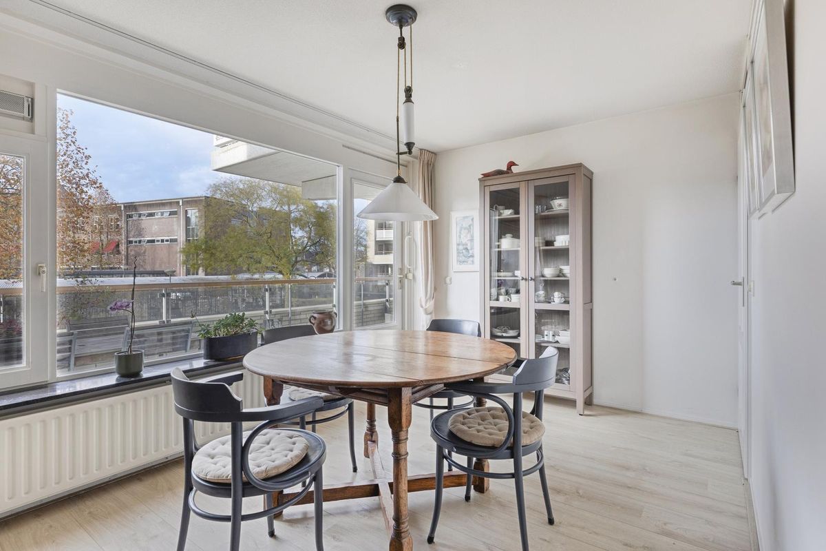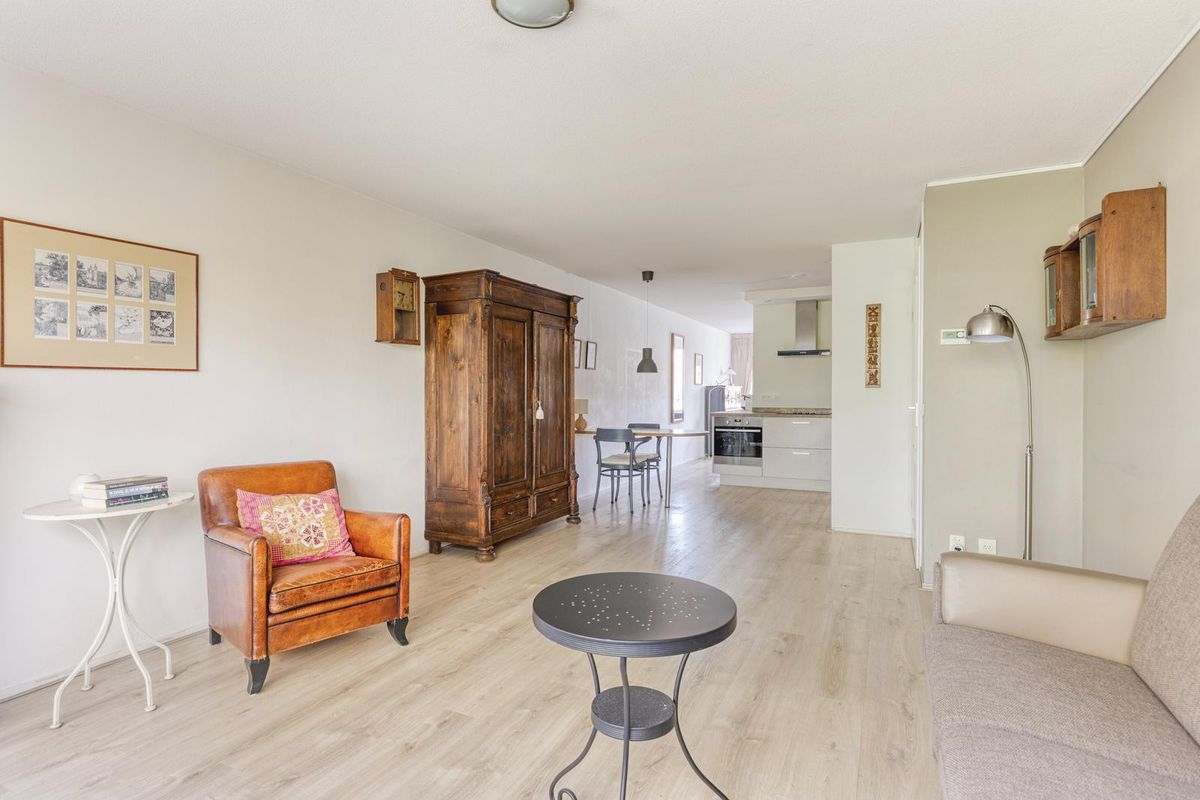 De woonkamer, de eetkamer en de keuken zijn in totaal circa 46,5 m² groot. De woonkamer en de eetkamer zijn voorzien van grote raampartijen, die zorgen voor veel lichtinval. De woonkamer staat in open verbinding met de keuken. Vanuit de woonkamer heb je uitzicht op een parkachtige omgeving. De eetkamer geeft via een tuindeur toegang tot het balkon. Het balkon is circa 16 m² groot. Het op het westen gelegen balkon is de ideale plek om te genieten van de middag- en avondzon. Het balkon heeft kunstgras.