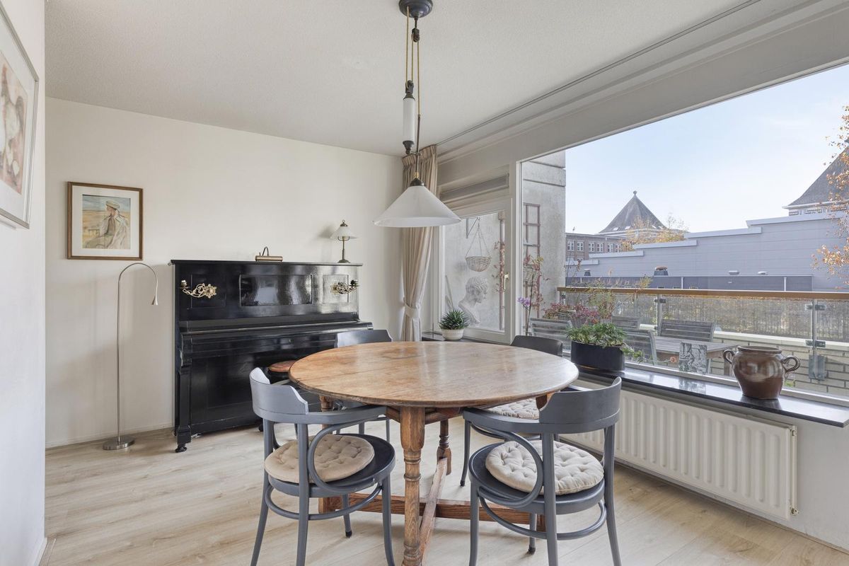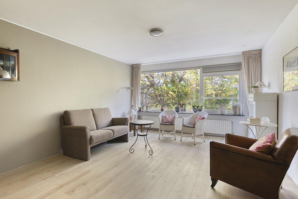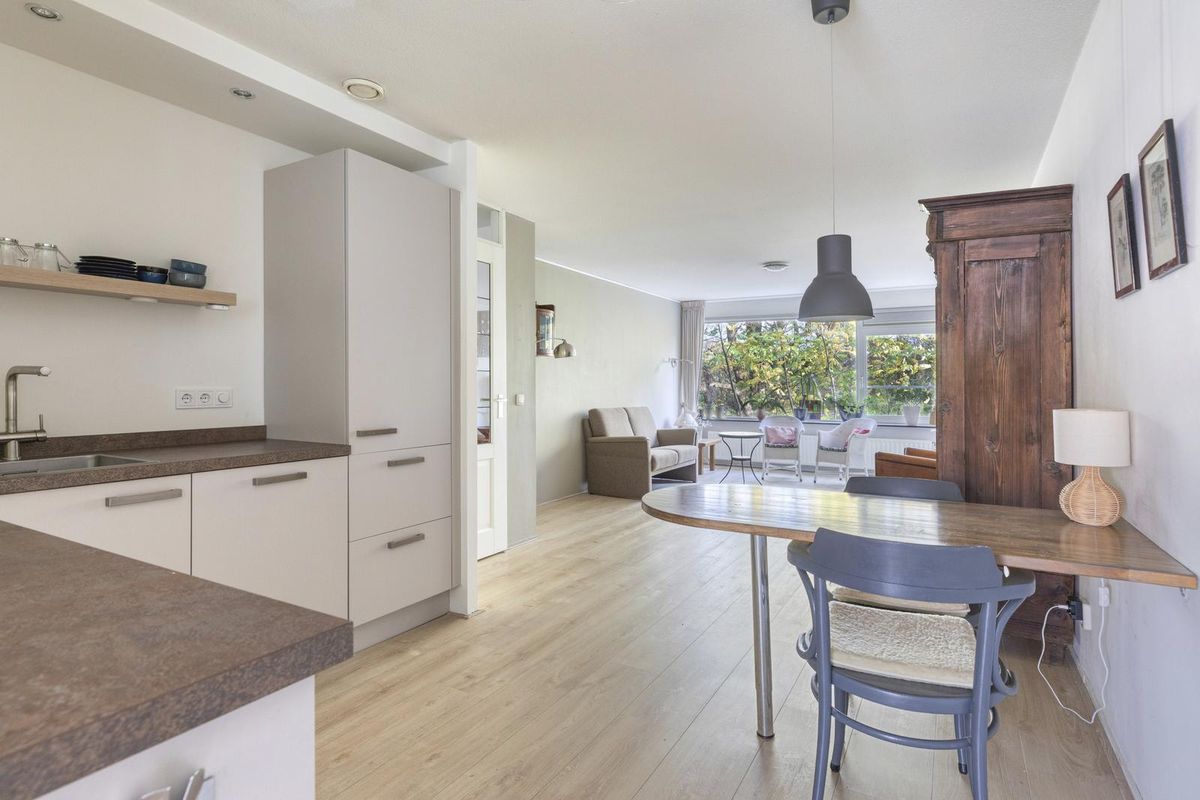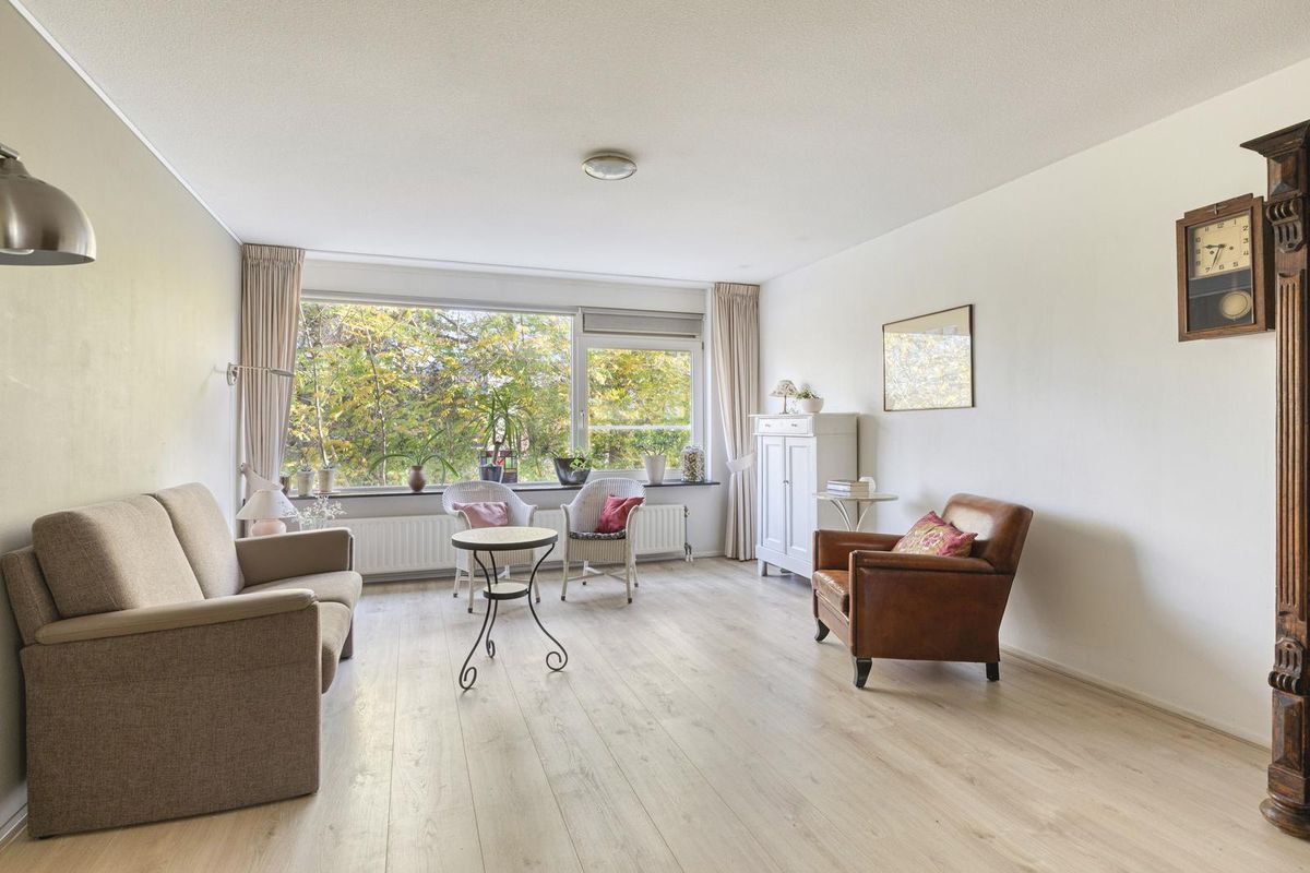 De woonkamer, de eetkamer en de keuken zijn in totaal circa 46,5 m² groot. De woonkamer en de eetkamer zijn voorzien van grote raampartijen, die zorgen voor veel lichtinval. De woonkamer staat in open verbinding met de keuken. Vanuit de woonkamer heb je uitzicht op een parkachtige omgeving. De eetkamer geeft via een tuindeur toegang tot het balkon. Het balkon is circa 16 m² groot. Het op het westen gelegen balkon is de ideale plek om te genieten van de middag- en avondzon. Het balkon heeft kunstgras.