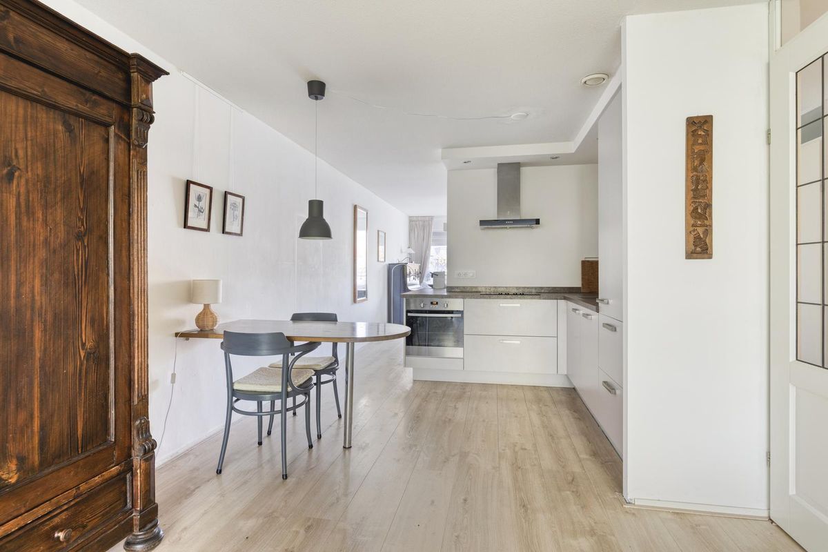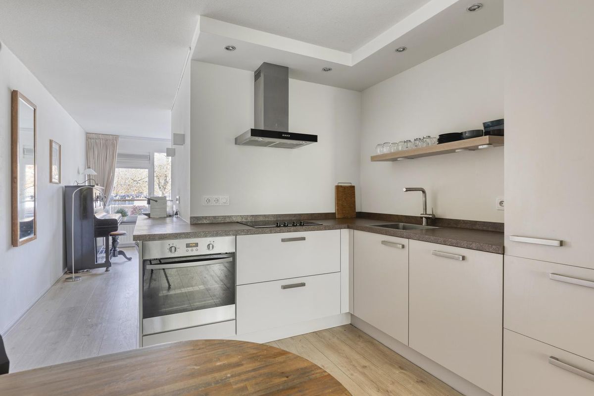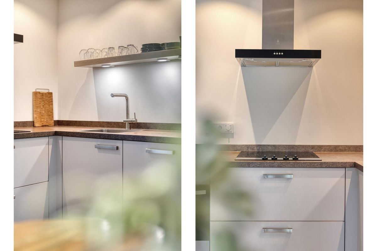 De keuken beschikt over een keukenblok voorzien van één spoelbak, een inductiekookplaat, een afzuigkap, een oven, een koelkast, een vaatwasser en diverse laden en kasten.