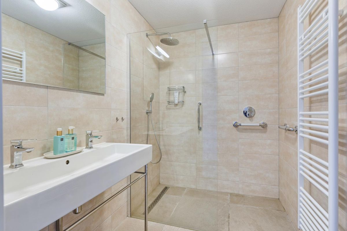De deels betegelde badkamer beschikt over een inloopdouche (met een thermostaatkraan), een wastafel (met twee kranen) en een designradiator.