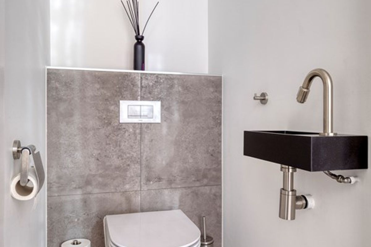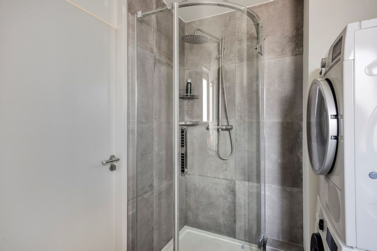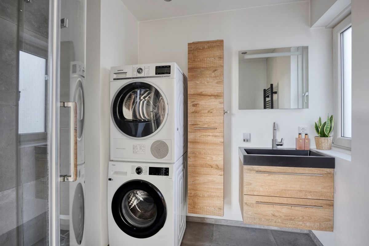 De moderne badkamer (uit 2019, circa 6 jaar oud) is uitgerust met een douchecabine, wastafelmeubel met lades, designradiator en een raam voor daglicht en natuurlijke ventilatie. Hier bevindt zich tevens de opstelplaats voor de wasmachine en droger. Het toilet is separaat.
