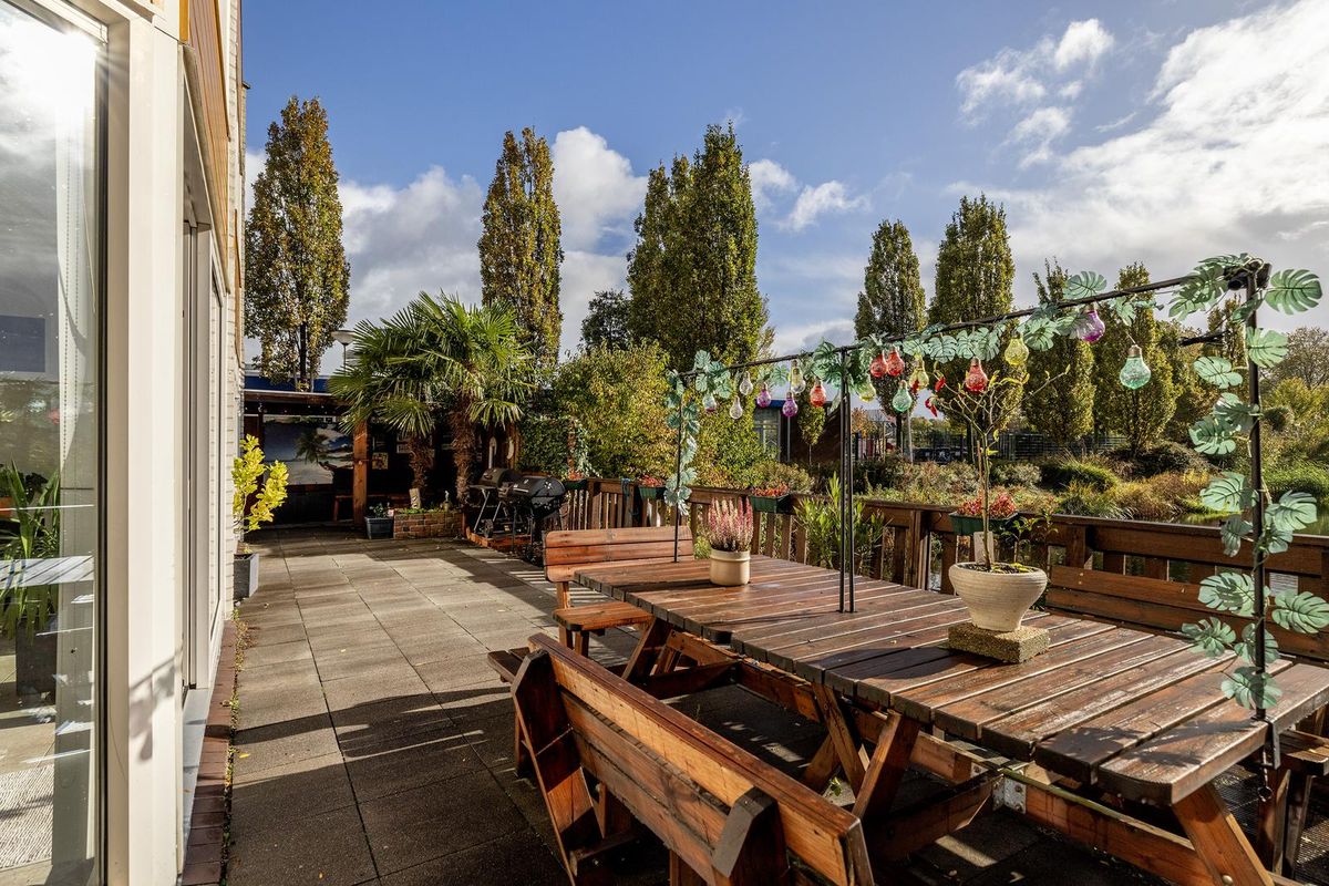 * Op het zuiden gerichte achtertuin aan het water met betegeld terras en fraaie overkapping.