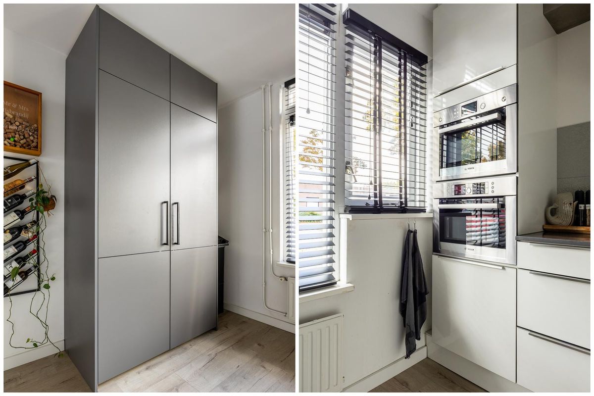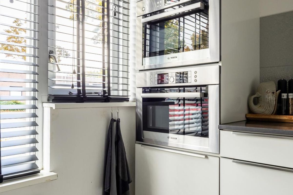 Aan de voorzijde bevindt zich de open keuken in hoekopstelling, voorzien van diverse inbouwapparatuur, waaronder een gaskookplaat, afzuigkap, oven, combimagnetron, koel-vriescombinatie en vaatwasser. Een fijne plek voor wie graag kookt en toch in contact wil blijven met de rest van het gezin of gasten.