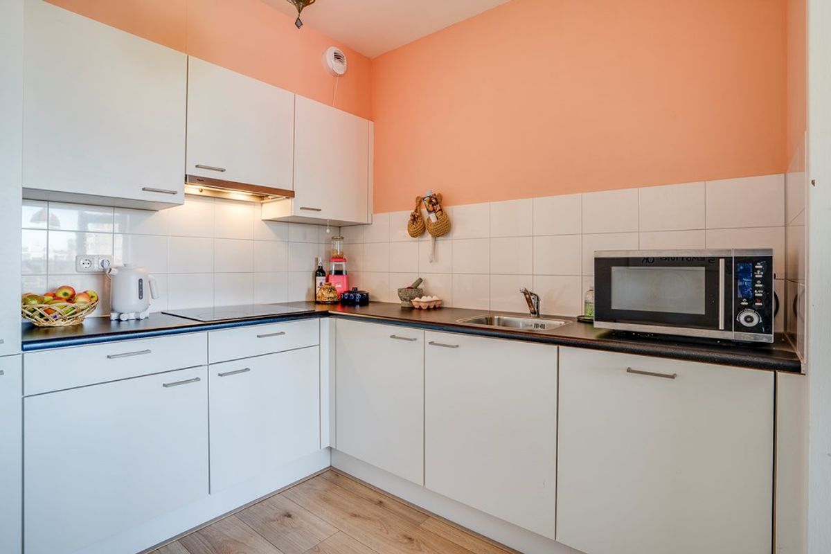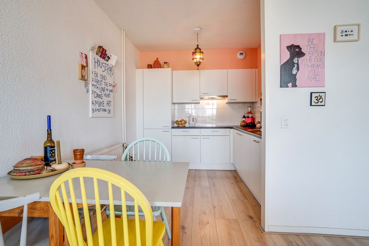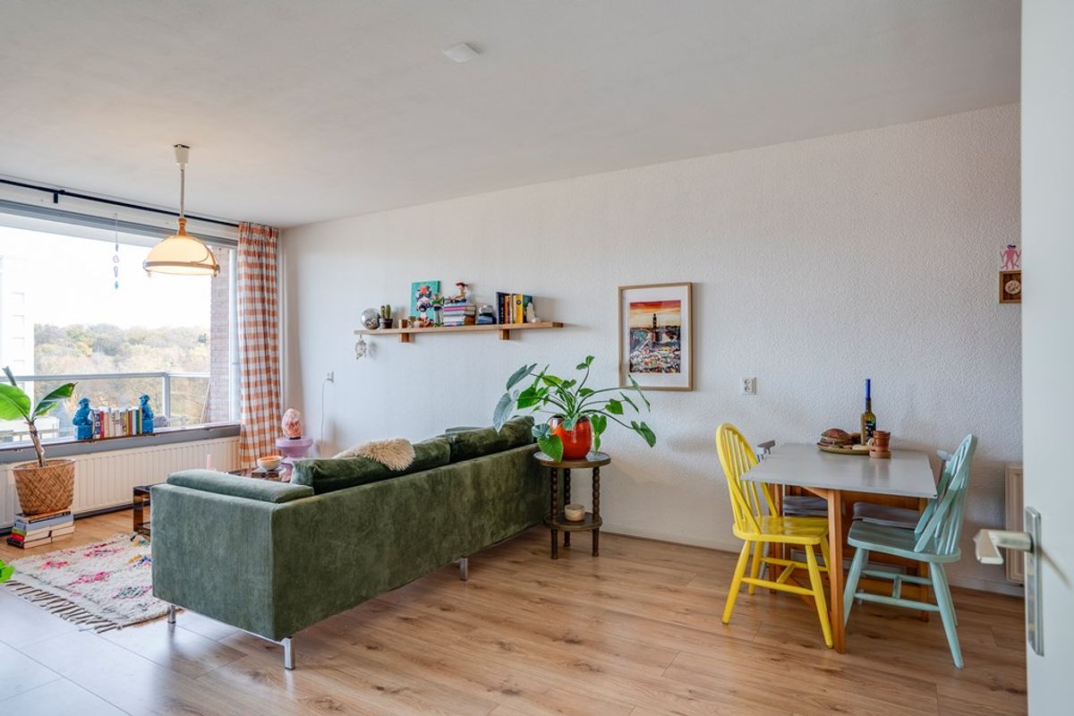 De woonkamer voelt licht en ruim aan en geeft direct toegang tot het balkon.