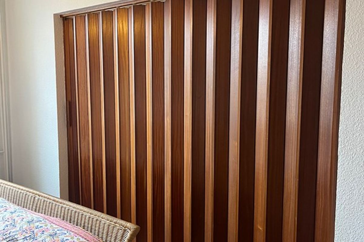 De slaapkamer ligt aan de rustige achterzijde van het appartement. Via een vouwwand staat deze ruimte in verbinding met de woonkamer. Je kunt de slaapkamer openlaten voor een ruimtelijk effect of afsluiten voor meer privacy.