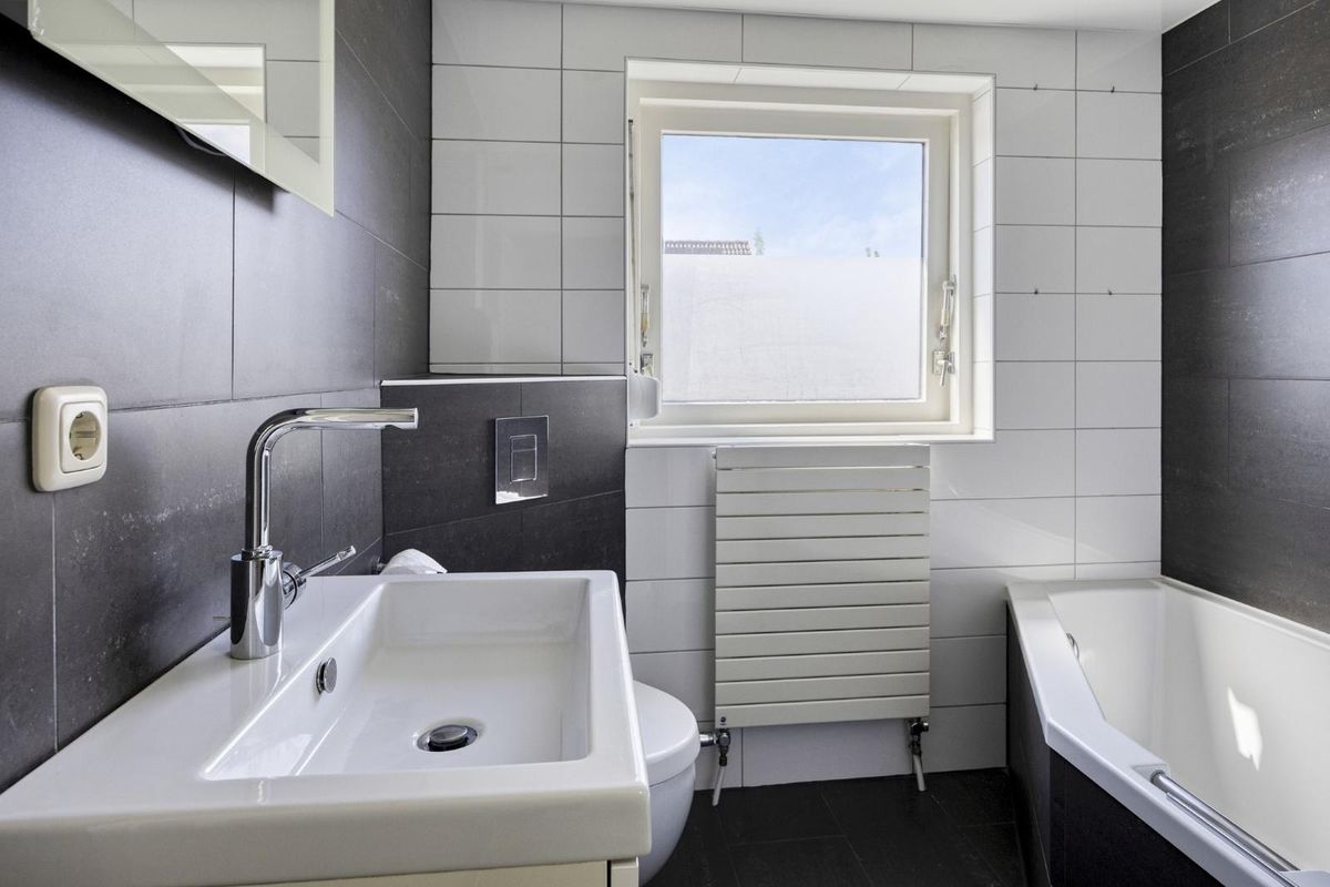 De badkamer heeft een frisse en moderne uitstraling, met een nette tegelafwerking, een ligbad met douchefaciliteiten, toilet en wastafel, stijlvol en praktisch tegelijk en helemaal klaar voor dagelijks gebruik.
