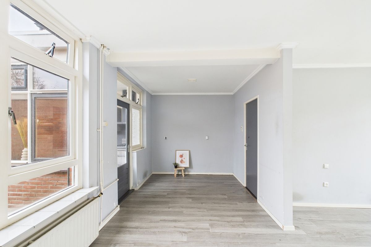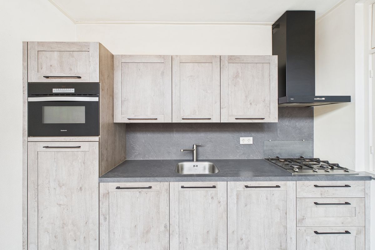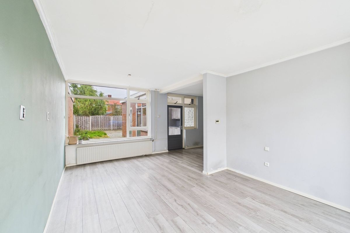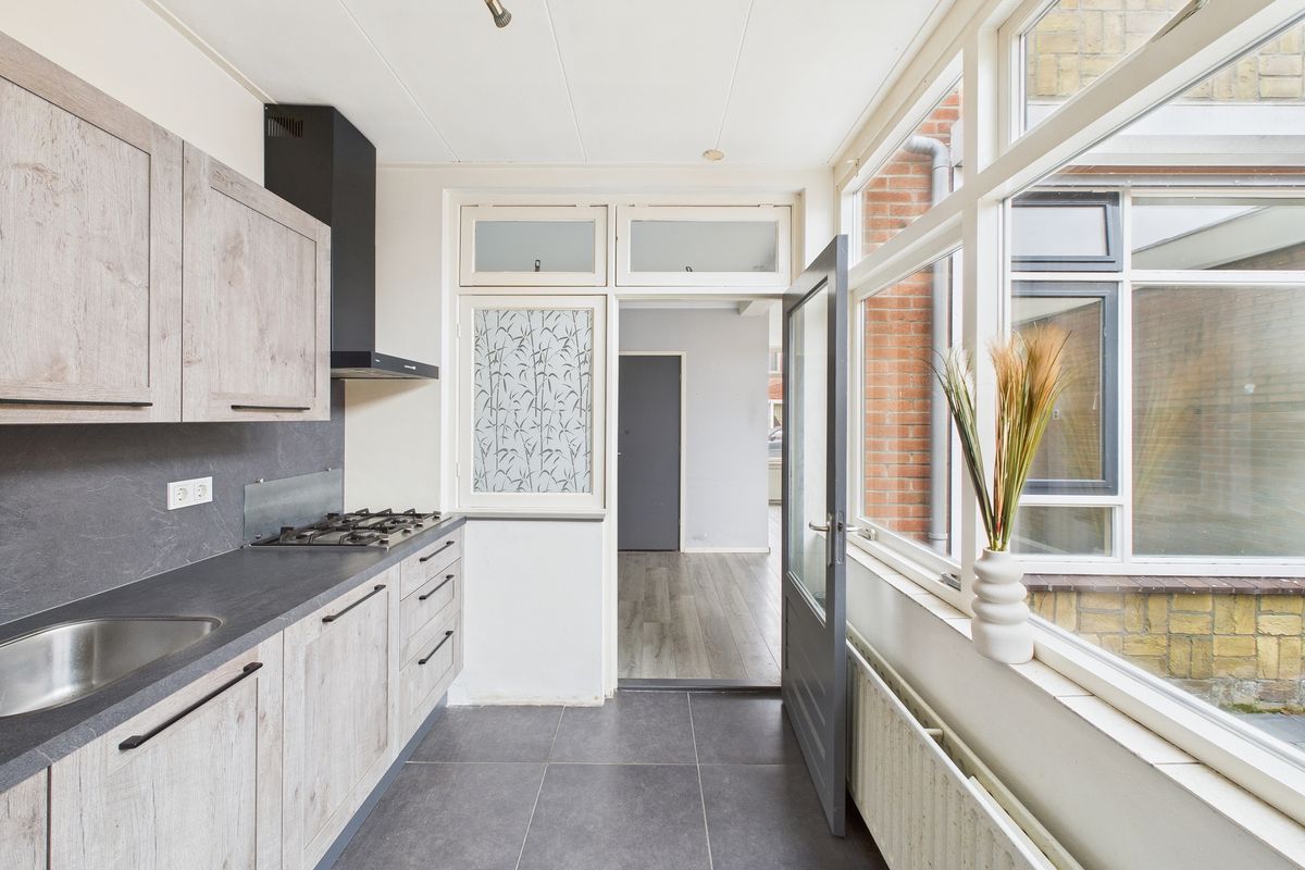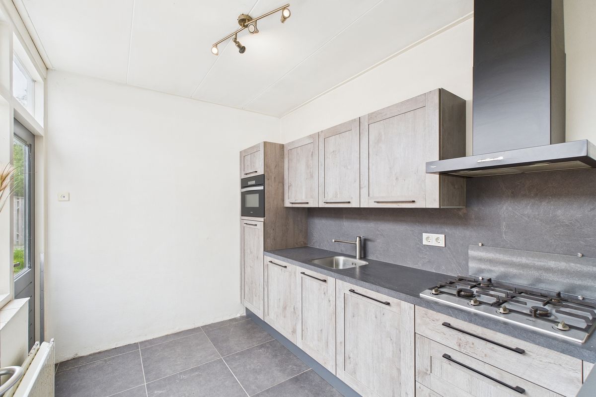 Inkomhal met meterkast, opgaande trap met trapkast en toegang naar toilet en woonkamer. De woonkamer is een open ruimte met grote ramen aan de voorzijde en achterzijde waardoor er veel licht naar binnen valt. De woonkamer is voorzien van een nette laminaat vloer, verder is de ruimte nog volledig naar eigen smaak aan te passen. Dankzij de rechthoekige indeling is er volop plek voor een gezellige zithoek én een ruime eethoek. Een ideale leefruimte om helemaal naar wens in te richten. De keuken bevindt zich in de uitbouw en is vernieuwd en voorzien van diverse inbouwapparatuur zoals een gasfornuis, afzuigkap, koelkast, oven en vaatwasser.