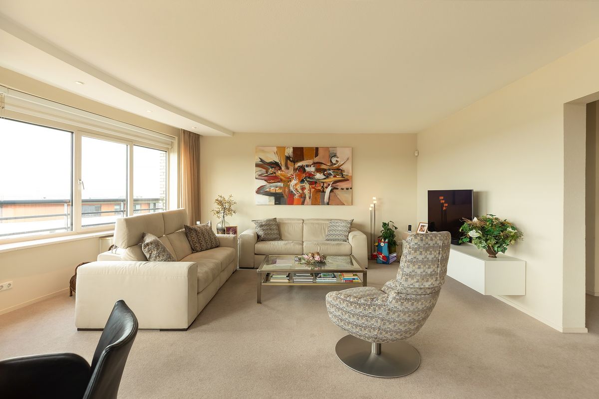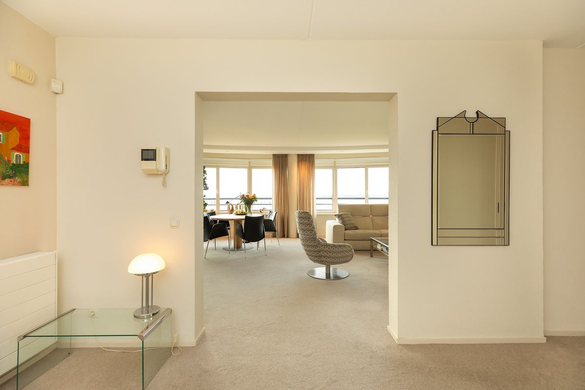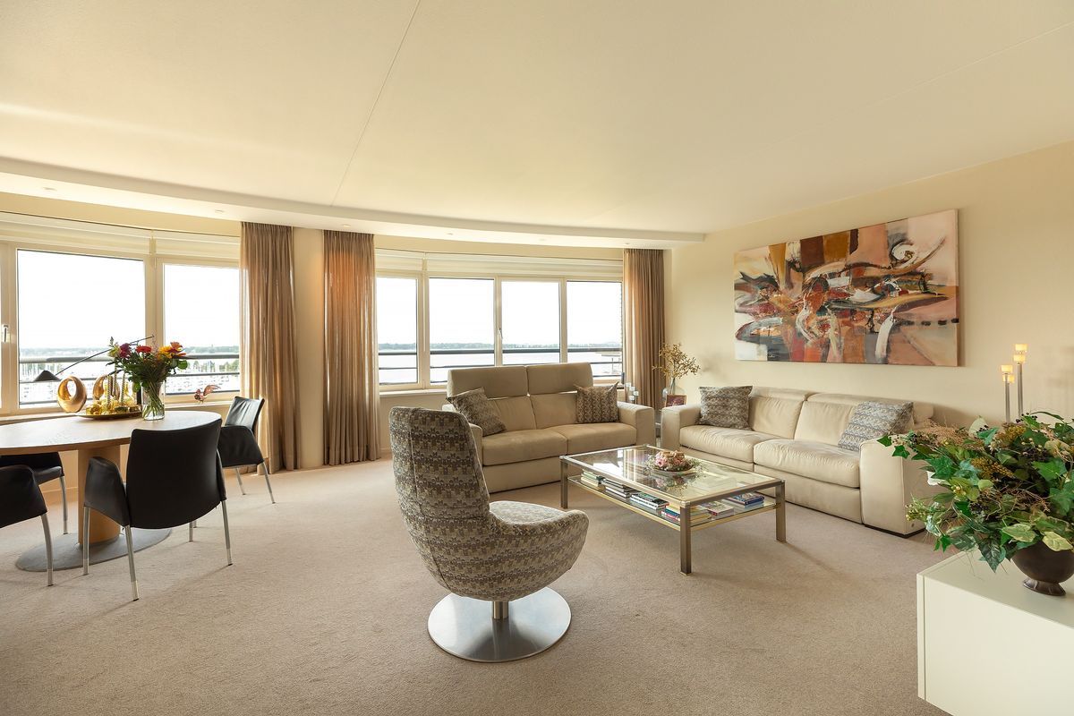 De royale living met zijn karakteristieke ronde gevel en kamerbrede raampartijen biedt een adembenemend uitzicht over het water. Dankzij de gunstige zonligging baadt de ruimte in daglicht. De strak gestucte wanden, elektrische zonnescreens en het serene kleurgebruik zorgen voor een stijlvolle en tijdloze uitstraling — comfortabel wonen met uitzicht als levend schilderij.