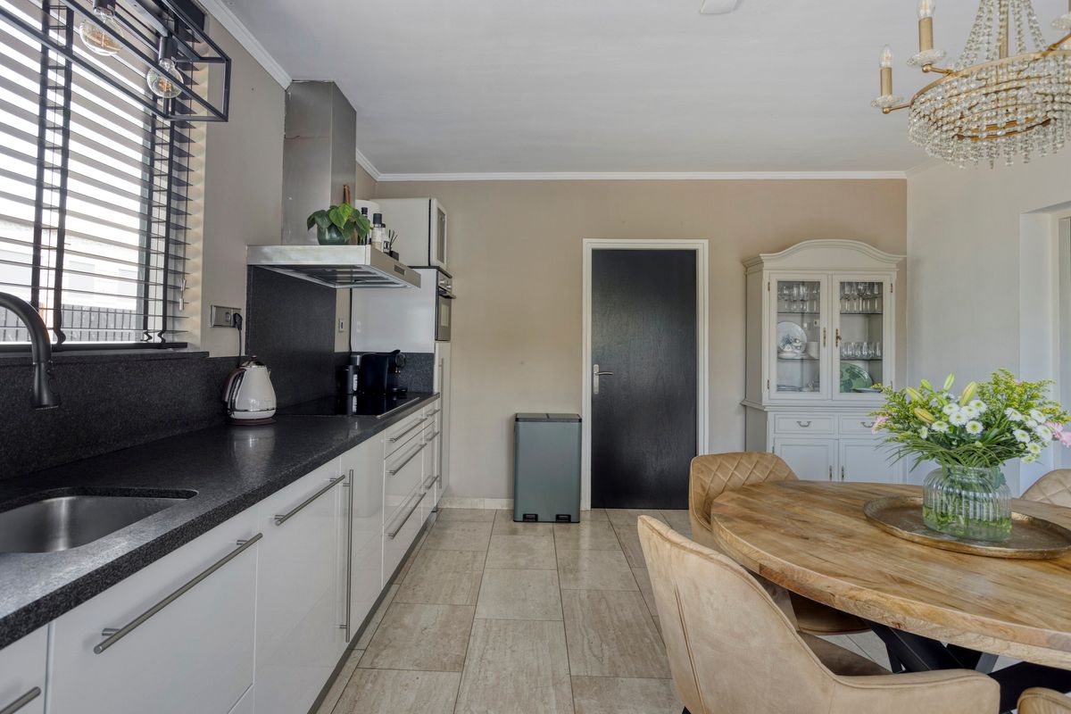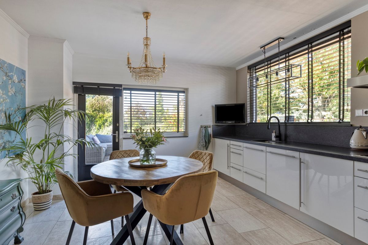 Ruime woonkeuken, praktisch ingedeeld en voorzien van inbouwapparatuur.