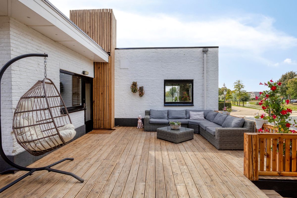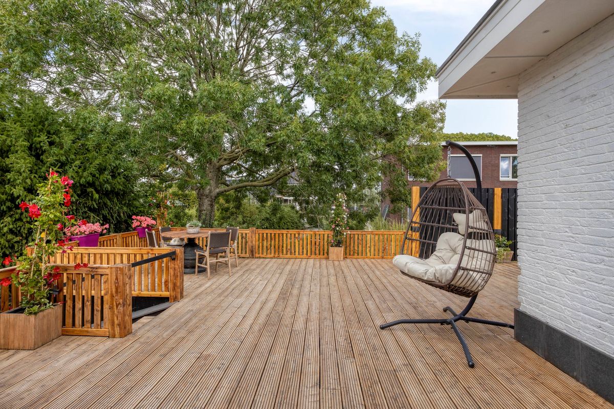 De tuin rondom is fraai aangelegd en biedt altijd een zonnige plek. Aan de achterzijde grenst de woning aan een ruim terras, perfect voor lange zomeravonden. Het royale perceel van 1.069 m² geeft volop mogelijkheden voor tuinliefhebbers of het creëren van een speelplek.